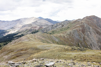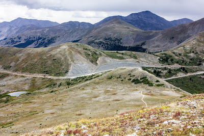 We stopped atop Cottonwood Pass on the return, and I hiked to the summit—Kay partway—of a nearby mountain, reaching almost 13,000 feet with occasional spitting rain mixed with the drizzle. The trail was marked by one switchback after another, and I had to stop often to catch my breath. The next to last photo was taken atop the mountain, at almost 13,000 feet. The last photo shows the switchback trail, and Kay near the bottom, is nearly invisible. The descent was much easier and faster.