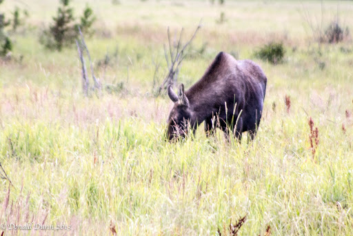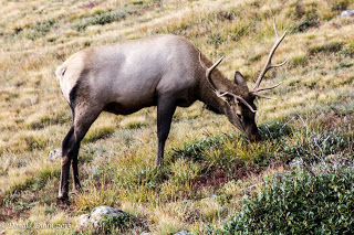 The four of us drove to RMNP and immediately saw a cow moose near the same location as the previous two days. We also saw a few elk along the road before beginning our ascent on the Trail Ridge Road. We stopped at a couple of overlooks on the way to the Alpine Visitors Center; there, we saw large bull elk and his harem in the glacial valley below, and a yellow-bellied marmot sunning itself on a nearby boulder.