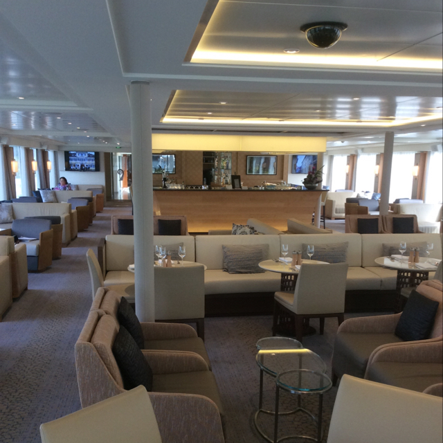 Our room is one of the least expensive ones, and located mostly below the waterline; this has not posed a problem as the boat is extremely quiet and smooth. Otherwise, the room is much like those of other ships we’ve sailed, in both size and amenities, except more technologically advanced; we especially like the 110V electrical outlets. The bed is very comfortable and I have slept better onboard than at home (maybe the free beer and wine with meals). Perhaps next time we will upgrade, though, for a balcony.
