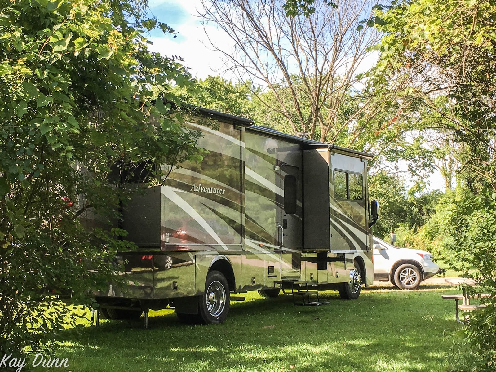 Lifting the stabilizing jacks, drawing the slides in, and unhooking from shore power, we were driving north again by about 8:30 am. Continuing through picturesque rural Illinois, the 290-mile drive was uneventful—just the way we like—as we arrived at Rock Cut State Park in Rockford, Illinois, about 2:45 pm. Again, we hooked up only to 50A electricity, making setup quick and easy. (NOTE: The motorhome has sufficient onboard water and sewer capacity for us to travel several days without refilling/dumping.)