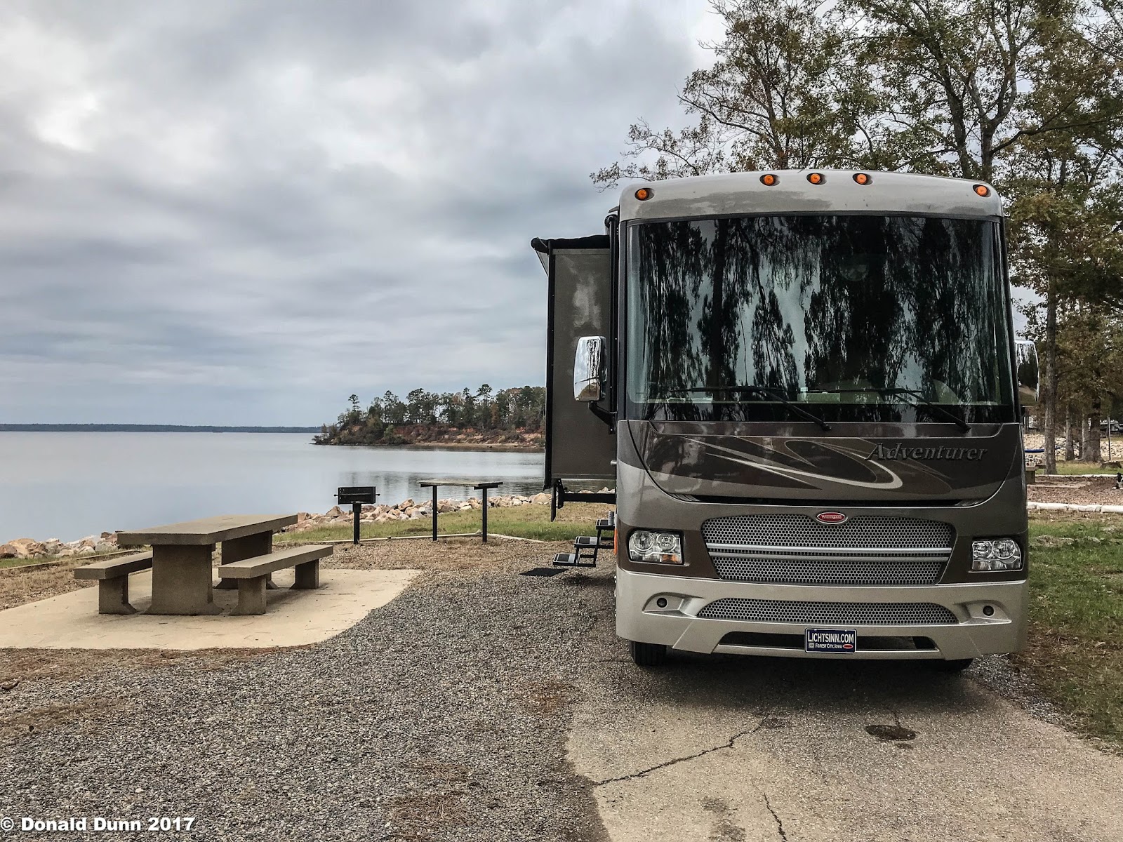 We awoke Monday with few expectations, thinking that the motorhome would not be ready today. However, we received a call from the Hot Springs Ford dealership just before lunch advising that the technician worked Saturday disconnecting the old wiring harness, allowing him to expedite hooking everything back up this morning. We drove to Hot Springs, paid the bill, hooked up the Honda tow car, and were on our way south once again. This time, no problems, as we pulled into Rocky Point Campground about 3:00 pm. A prime site with a lake view was open, and after setting up, a wave of relief overcame us.