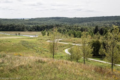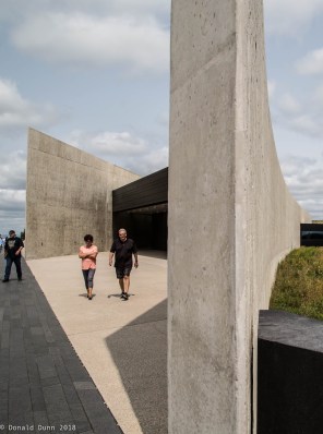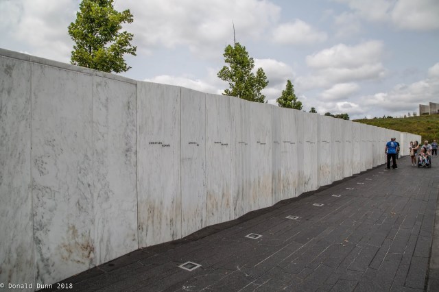 The National Memorial is in two parts: the upper area where the Visitor Center and towering, curved walls are located and the lower area where a wall memorializes the crew and passengers, listing their names. The entire memorial is well done, with many symbolisms, etc. For example, the walls adjacent to the Visitor Center follow the flight path of Flight 93 just before it crashed. The slight curve is almost imperceptible, until viewed from a distance, particularly looking at the crash site. The crash site itself is marked by a huge boulder, underneath where the remains of the plane are buried.