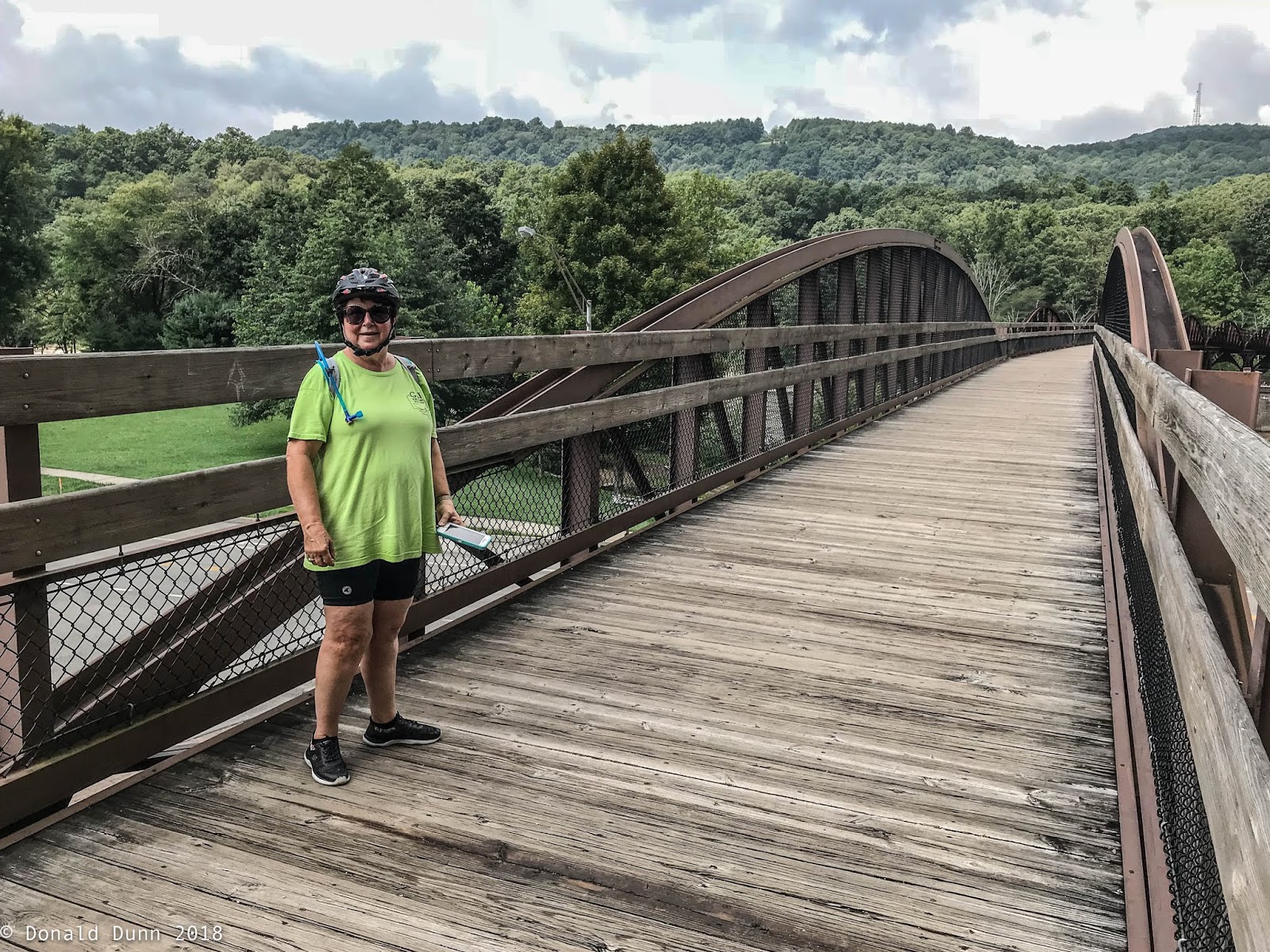 Our afternoon ride continued across the Youghiogheny River along the tree-tunneled trail another 17 miles to Connelsville. The trail was very similar to the Katy Trail in southern Missouri with rock bluffs on one side and river (Youghiogheny) on the other, bringing back fond memories of our ride in October 2016. No breaks were scheduled for the 17-mile ride because of lack of access to the trail for the SAG (support and gear) wagon, making for a long ride.
