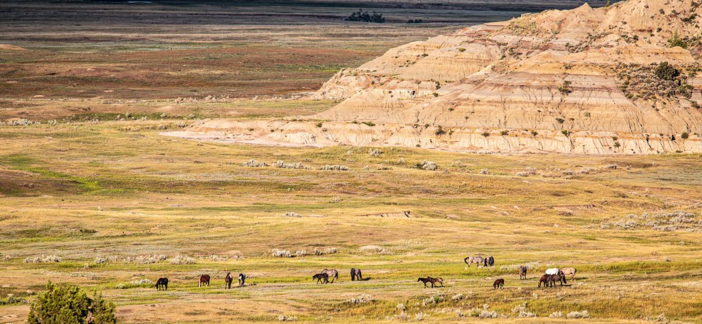 We have been blessed to see so many wild animals in Theodore Roosevelt National Park, including American Bison, Black-tailed Prairie Dogs, wild Horses, wild Turkeys, and Big Horn Sheep—everything except for an elk which are rarely seen even by USNPS employees. The wild horse herds in the South Unit have ancestry dating back to the Wild West days of the late 1800s. Some say they are descendants of Crazy Horse’s herd, while others say their genetics are from the days in the late 1800s when ranches would turn horses loose, and catch and break them as needed. They look like pets, but are not at all docile.