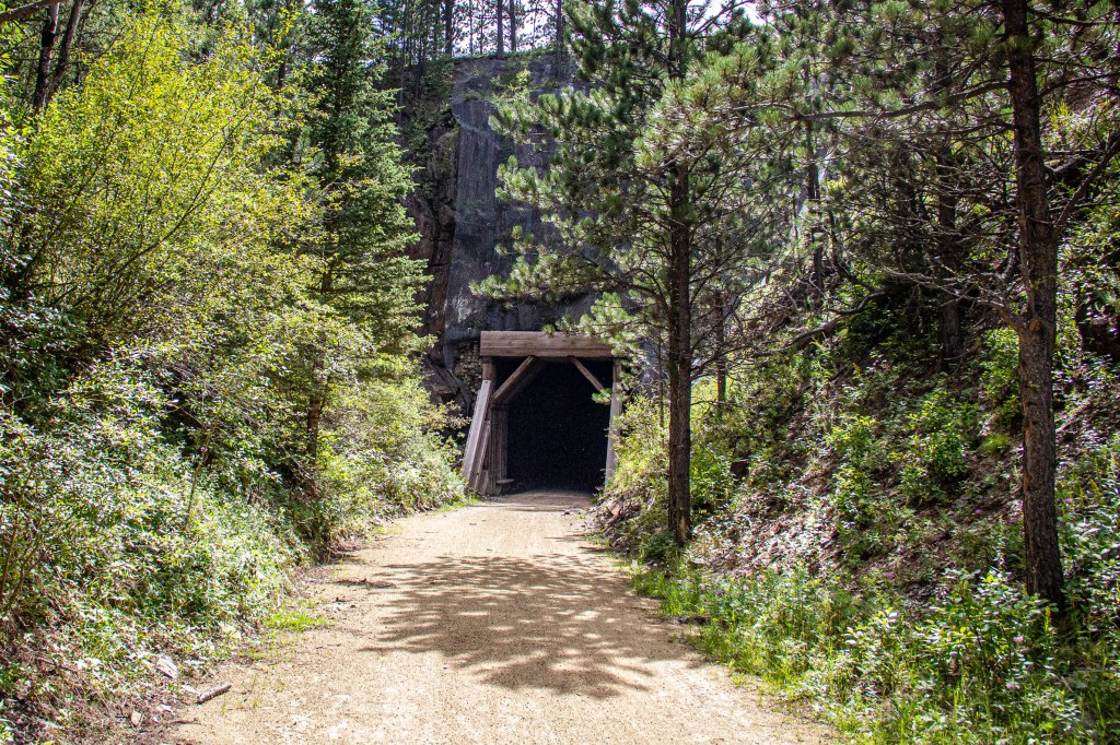 Kay shuttled me to Dumont Trailhead where I changed into a riding kit ( Spandex padded bibs and a Lycra Spandex KATY Trail Jersey). A “Beginning” photo was made and the ride south to Mystic Trailhead began. The first part of the trail sided a highway, but differences in elevations reduced traffic noise such that it was barely noticeable. Much of the adjacent land was being used as rangeland; consequently, several gates were across the trail. Accompanying old homesteads wildflowers bloomed along much of the trail and remnants of ranches were sparsely scattered about in this narrow valley. Further along, the gurgling sound of a trail side brook could be heard as the bicycle glided downhill. Just north of the Rochford trailhead, the first of 4 tunnels on the Mickelson Trail appeared (Tunnel “D” on the official trail map. MP 85.3). Even without sunglasses, going from daylight into the tunnel was a near blackout experience despite the bicycle’s strong headlight being on its brightest setting.