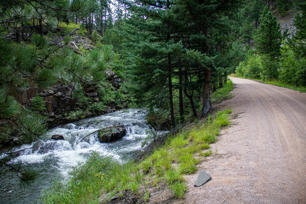 At Dumont the right pedal was tightened with a large wrench at a trailhead bicycle tool station. The trail began an uphill 1.5 mile segment before flattening at it’s highest point at 6,216 feet. And then the fun began—for the next 5 or so miles the downhill trail ran through a deep forest, requiring little to no pedaling, and I reached a maximum speed of 33 mph (an advantage of having a big body) and probably exceeding the trail speed limit. Another short uphill section was followed by a couple of miles of flat trail. At this point, a spur trail broke off the left towards Lead, South Dakota, and residential and commercial development could be increasingly observed. In a hurry to reach Deadwood before dark, I inadvertently forgot to make photos—shame on me. The ride was 16.49 miles with an elevation gain of 349 feet, making the afternoon’s total 34.68 miles with a total elevation gain of 538m feet.
