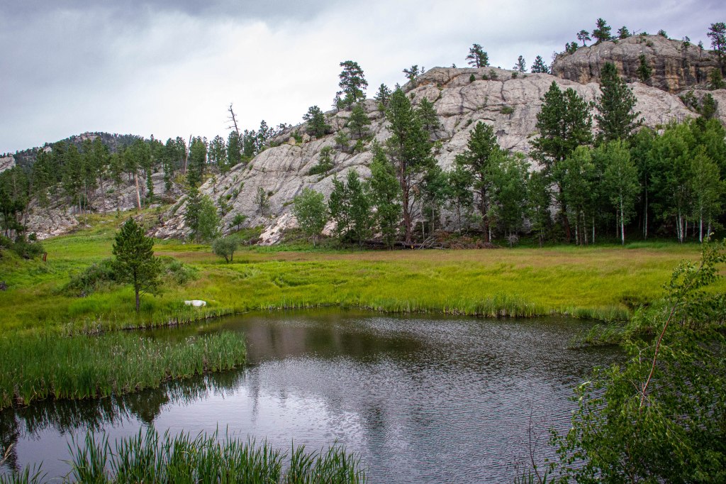 Today’s ride was another two-parter. The first leg started at the Mountain Trailhead (MP 49.6) north of Custer, South Dakota. It was cold, very windy with 15+ mph winds out of the NNW, and spitting rain. The short 20-minute downhill ride was through a lush valley wrought with rock formations and small lakes, another piece of paradise, ending at the Harbach Park Trailhead (MP 44.5) in the resort town of Custer, SD. It was mostly downhill and WITH the wind.