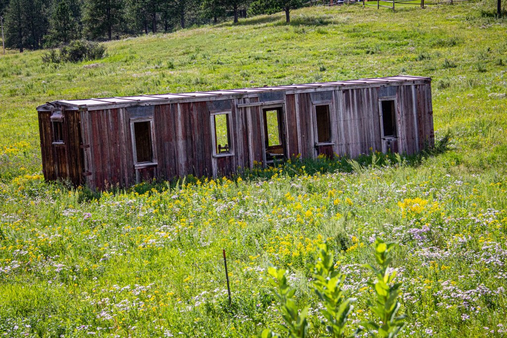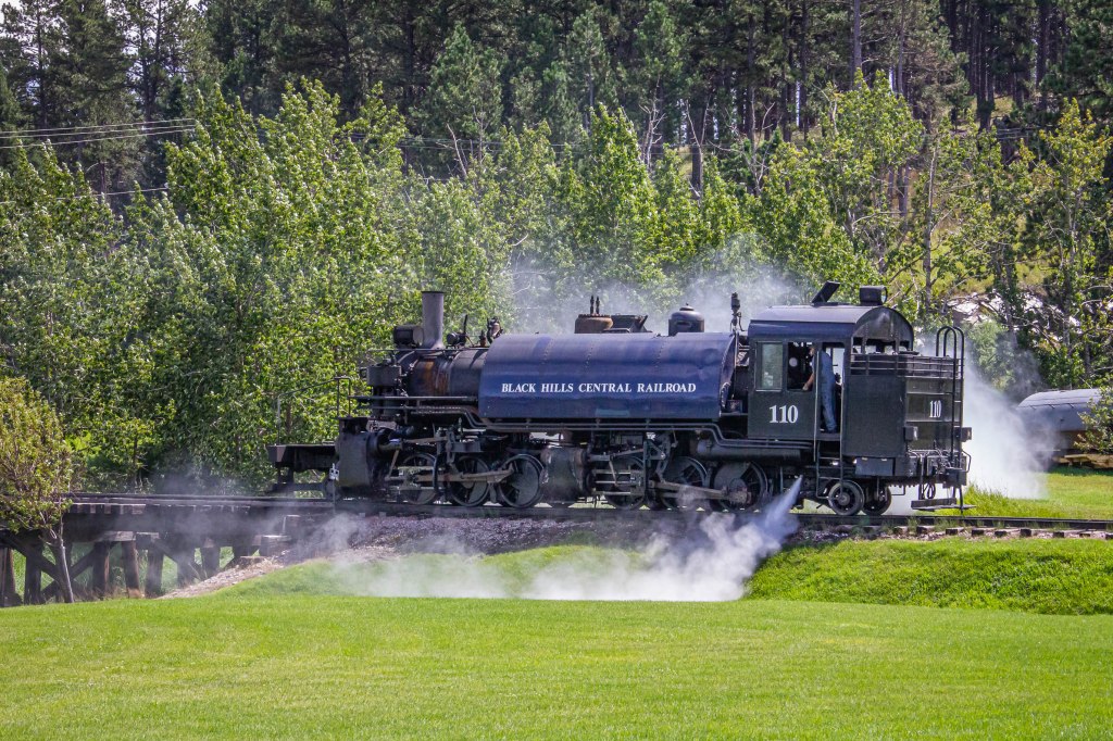 The second leg would provide proof that I needed to lose a LOT of weight and get in shape! This part of the ride began at the Mountain Trailhead (MP 49.6) and proceeded northward. Immediately the Crazy Horse memorial came into view on the east side of the trail. Despite being uphill for the first 1-3/4 miles, pedaling was pleasant, especially knowing that the next 9+ miles were essentially downhill. Heavy rains, 3-1/2 inches the last couple of weeks and last night’s rain, combined to erode sections of the trail and deposit soft sand, now wet, in other sections. I had to pick the downhill track carefully, and the wet sand seemed to suck the air out of the 38mm tires, making for a slow downhill ride into Hill City (MP 60.1), where the trail lay beside a very nice railroad museum. I knew today would be the hardest, but had no idea how grueling it would be. As the uphill part (8 miles) of today’s ride approached, trail conditions worsened: the track was wet with long sections of soft wet sand, wind was howling down the trail, seemingly directly head on, the trail was uphill, and the elevation above 5,000 feet. I would have to stop often, and sometimes walk the bicycle. However the valley widened and scenery was again spectacular, including a small stream running beside the trail. Remnants of old mines and railroads were plentiful trailside. Finally, I made the crest and enjoyed a two mile downhill respite before another mile and a half uphill run, followed by a four mile downhill/level pedal to the Mystic Trailhead (MP 74.7), passing through two tunnels just north of Mystic. This segment was 25.88 miles with an elevation gain of 918 feet.