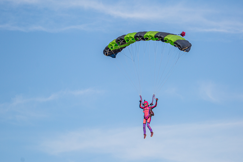 On the way back from Tucson, we stopped at Skydive Arizona. It is the largest skydiving operation in the world, sits near us in Florence, Arizona, halfway between Phoenix and Tucson. Although close to major highways, it is surrounded by flat, uninhabited land for miles in every direction. Visitors remark on the oasis like appearance of the center, which has plenty of grass, a swimming pool, and trees in the midst of an otherwise barren desert. Around the central building, which houses offices, aircraft manifesting, classrooms, and an indoor packing area, one can find everything a skydiver needs. Equipment sales, food, a shower and laundry facility, grassy camping area, recreation hall with bunks for overnight guests, and a basketball court are some of the many amenities. The fleet is led by 4 Super Otters and 7 Skyvans, each capable of taking 23 skydivers to 13,000 feet. A venerable DC-3, once the workhorse of the fleet, carries the occasional load of 43 jumpers. Rounding out the flightline is a Pilatus Porter. Altogether, these airplanes can put over 240 skydivers at a time in the air, or over 500 jumps an hour!