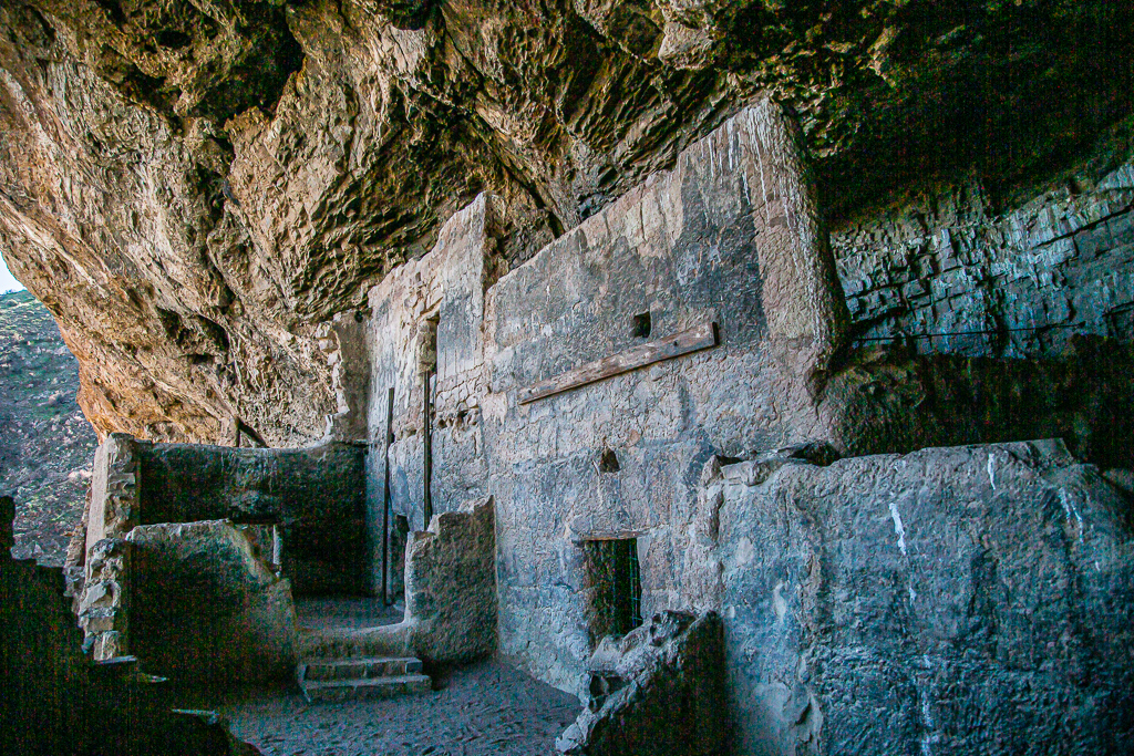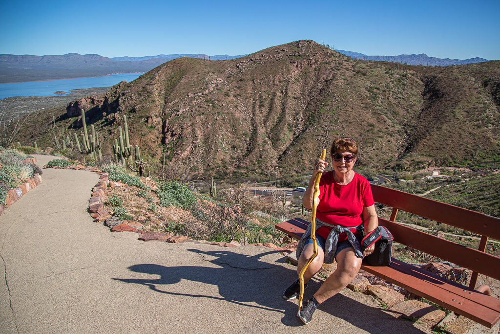 From Superior we drove east and north to Tonto National Monument in the Superstition Mountains, in Gila County of central Arizona. The area lies on the northeastern edge of the Sonoran Desert ecoregion, an arid habitat with annual rainfall of about 16 inches. The Salt River runs through this area, providing a rare, year-round source of water. The monument was established to preserve and protect cliff dwellings from the Salado culture built during the 13th, 14th, and early 15th centuries. The Salado people farmed in the Salt River Valley, and supplemented their diet by hunting and gathering native plants. The Salado were fine craftspeople, producing some of the most flamboyant polychrome pottery and intricately woven textiles to be found in the Southwest. We made the steep climb with only a few stops and enjoyed views of the surrounding landscape from sites along the trail. The preserved cliff dwellings were like many others we had seen in Arizona and New Mexico, and makes one marvel at the efforts of the Salado people.