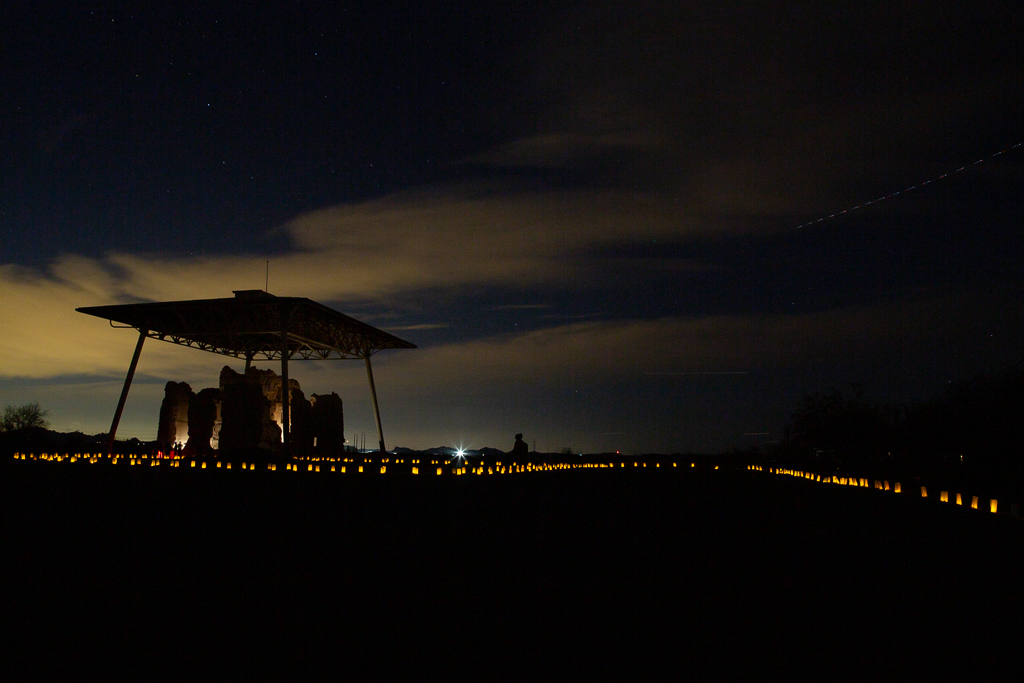 Departing early in the morning, I drove to Veteran’s Oasis Park in Chandler for one last visit this winter. A few birds posed as I walked the trails. I returned to Palm Creek, and then left before sunset to visit the normally closed Casa Grande National Monument for a luminary ceremony honoring the birthday of its first caretaker. There were a number of people there, many with children, making slow-speed photography (nighttime) difficult at best. I left there driving to the Tucson International Airport to pickup Kay returning from Arkansas. The airport provides a “cell phone” parking area near the gates for cars waiting on incoming passengers; after having arrived, the passenger may phone their pickup in the parking lot—neat and handy. Kay was glad to be back to great weather in Arizona.
