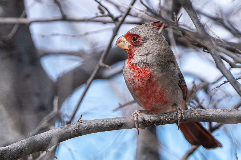 Our Monday travels took us to the San Pedro Riparian National Conservation Area where the winds were howling; a few birds posed for photographs. After hiking along the river for some distance, we returned to the San Pedro House Visitor Center where Kay astutely pointed out what I overlooked as a Northern Cardinal in one of the shrubs; it was a Pyrrhuloxia. Kay has become an invaluable asset to our birdwatching and photography.