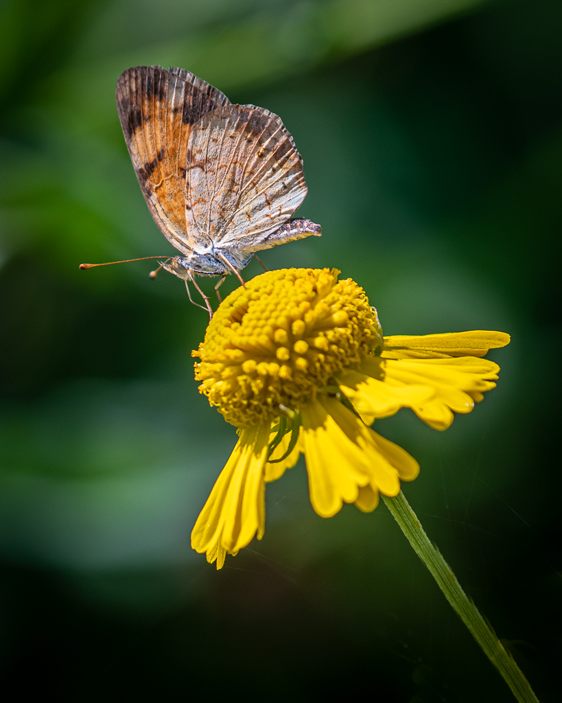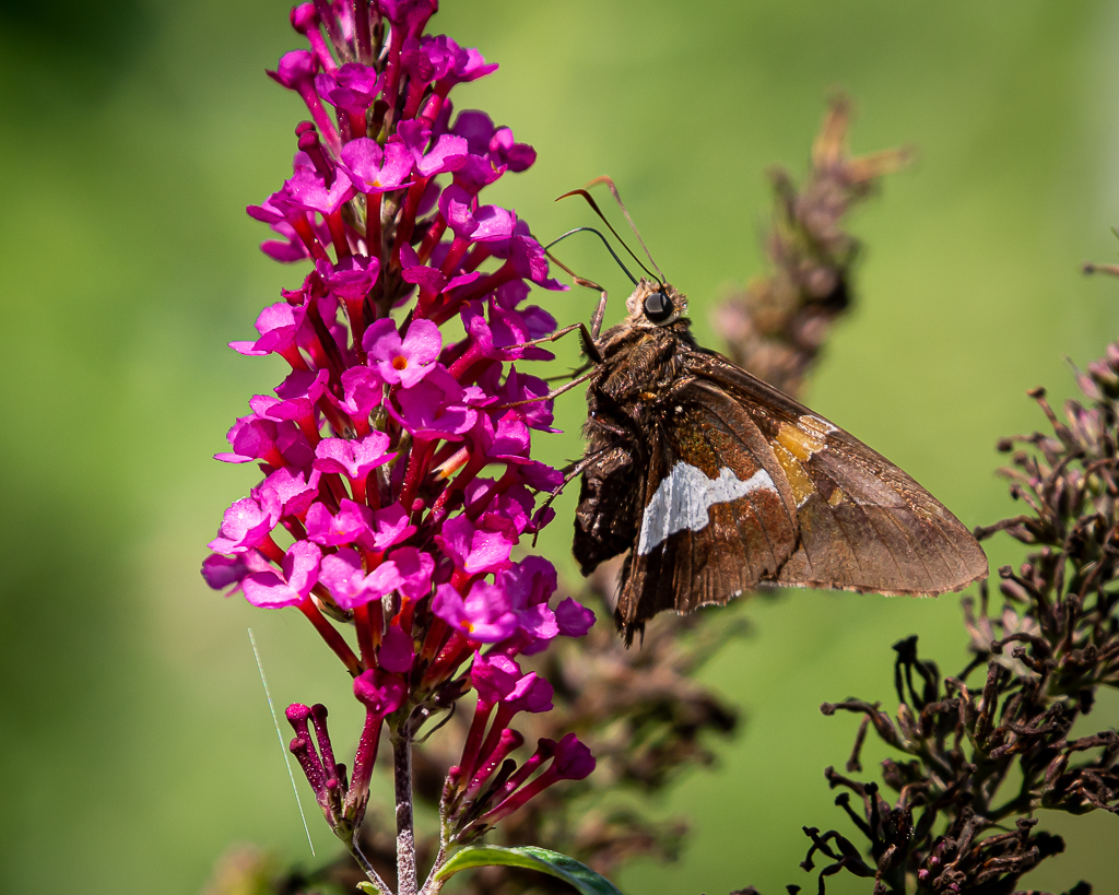 A second cup of coffee later, we drove to Junaluska. The wildflowers, butterflies, and two-mile walking path around the lake were too appealing to do only once (see blog post, Saturday, July 25). It was crowded, but about half the people were masked and most “socially distanced”. The area near where we parked had the best wildflowers and butterflies, but we walked the whole 2.1 miles, with the camera-mounted tripod (shy of 10 pounds) gouging holes in each shoulder—gotta remember to bring the padded tripod sleeve.