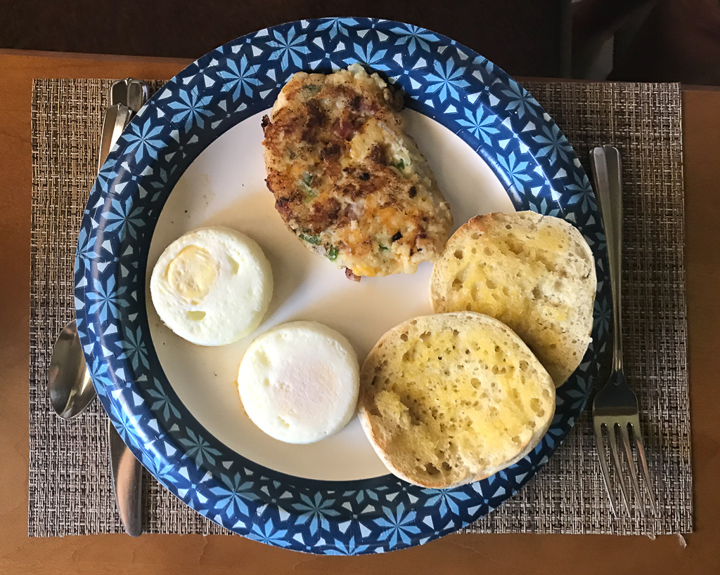 Baked eggs, pancake hash browns, and English muffin for breakfast