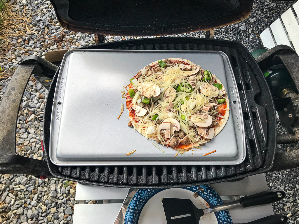 Having watched a VLOG entry on Getaway Couple (https://www.getawaycouple.com) where they had “pizza night”, the thought of having our own pizza night was quite appealing. However, we had to find an alternative to the calorie-rich entree. Using low carb tortillas, turkey sausage crumbles, green pepper, jalapeño pepper, onion, mushrooms, pizza sauce, and mozzarella and Parmesan cheeses, we gave it a try. With no pizza stone (we’ll remedy this next time we travel), we used an inverted cookie sheet, and cooled the pizzas 10 minutes on a HOT grill. OMG (oh my goodness), they were fantastic; this will become a regular on our trips.