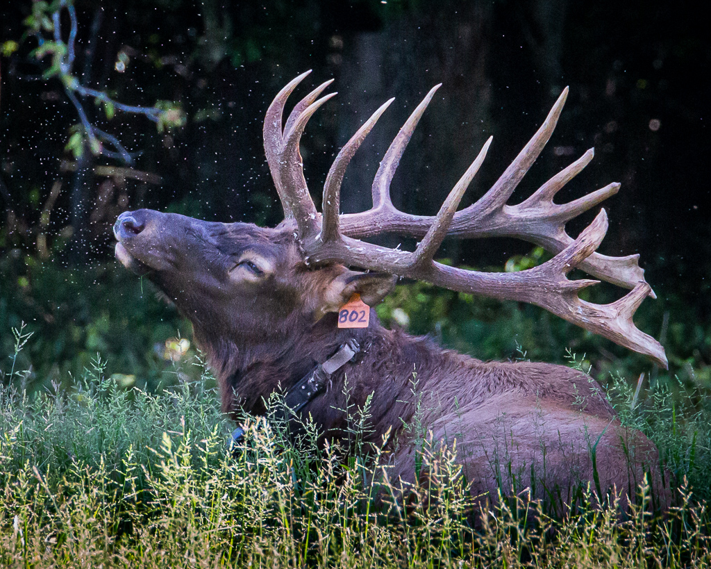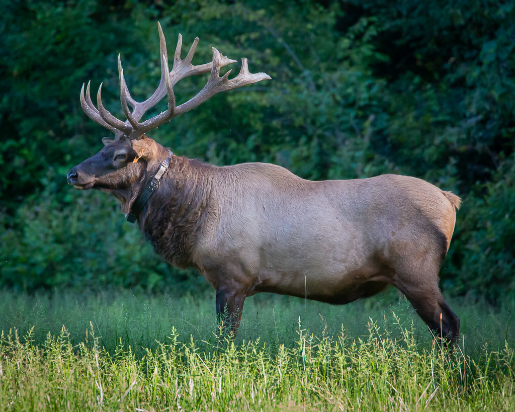After the invigorating walk at Lake Junaluska, we drove the steep and crooked road to Cataloochee Valley, nestled in the far northeastern part of Great Smoky Mountains NP, hoping to get a glimpse of the elk that graze there in late afternoon; we were not disappointed. As we entered the Valley, we noted a car of two stopped along side one of the pastures, and sure enough, elk were observed in the woods. And then, a big bull stepped out of another section of woods and began grazing alone.After a short while, he laid down, and to our surprise began bugling. If you’ve ever heard one bugle, you know what a thrill it is. A few other elk joined him, and others were observed in a pasture about a half mile away. The big bull posed for photographs for all the stopper-bys, and while the gnats swarmed around him,, the flies ate on me!