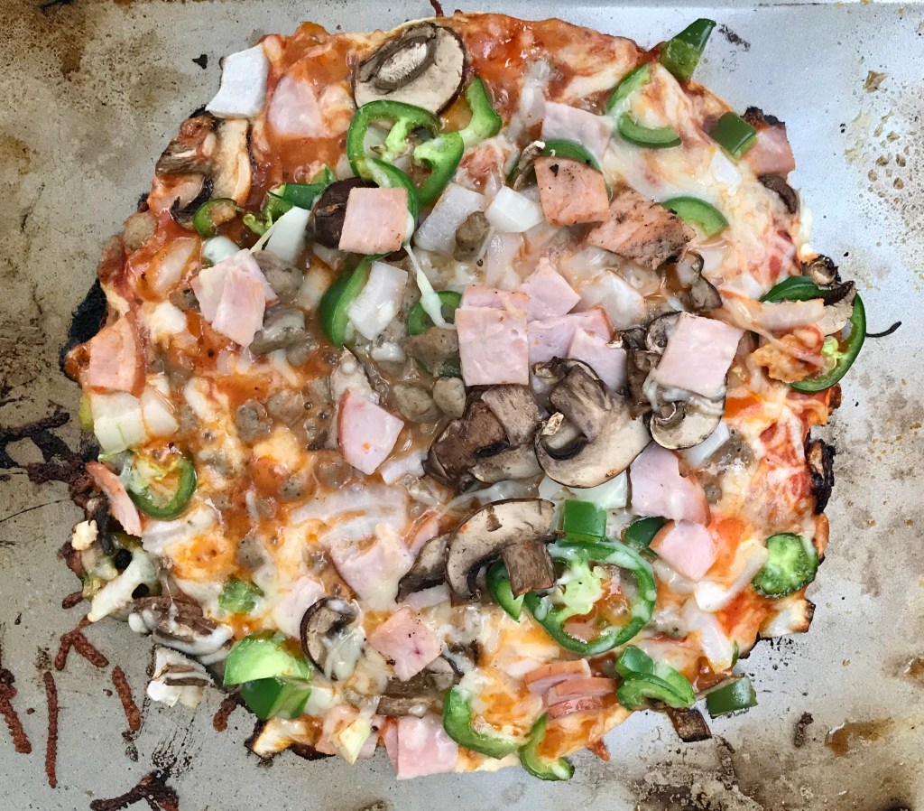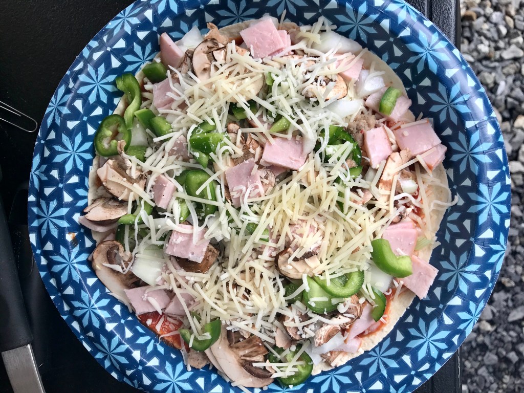 By Kay’s declaration, tonight is “pizza night”. After having our first adult beverages in several days, she diced Canadian bacon and chopped veggies—onion, green pepper, jalapeño pepper, and mushrooms. I spread pizza sauce on a couple of low carb tortillas (1 Weight Watchers point each), sprinkled shredded mozzarella cheese over the sauce, followed by pre-cooked Jimmy Dean turkey crumbles (tastes like sausage), and Kay’s Canadian bacon and Veggies. Since we don’t have a pizza stone in the motorhome—to be remedied for our next trip—I inverted a cookie sheet on the grill and cooked on that: 10 minutes on high. With leftover Caesar salad from last night, we had a great, satisfying dinner.