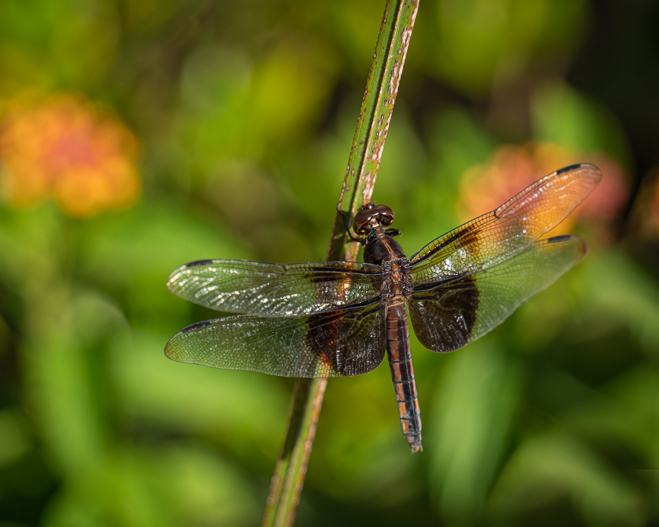 After doing a few chores outside in the back, Kay and I observed a solitary dragonfly, female Widow Skimmer, warming herself on a shrub.