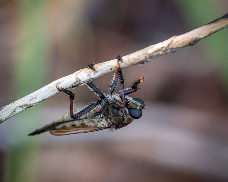Our first find was a robber fly, also known as an assassin fly. They are powerfully built, bristly flies with a short, stout proboscis enclosing the sharp, sucking hypopharynx. Robber fly insects are a mixed blessing to gardeners; if they’re seriously perturbed, they can inflict a painful bite, but they also help rid the garden of harmful pests like grasshoppers, other flies, wasps, leafhoppers, white grubs and pupating beetles. Both Dan and I have become enamored with them, and most of the time we see them, they are eating prey.