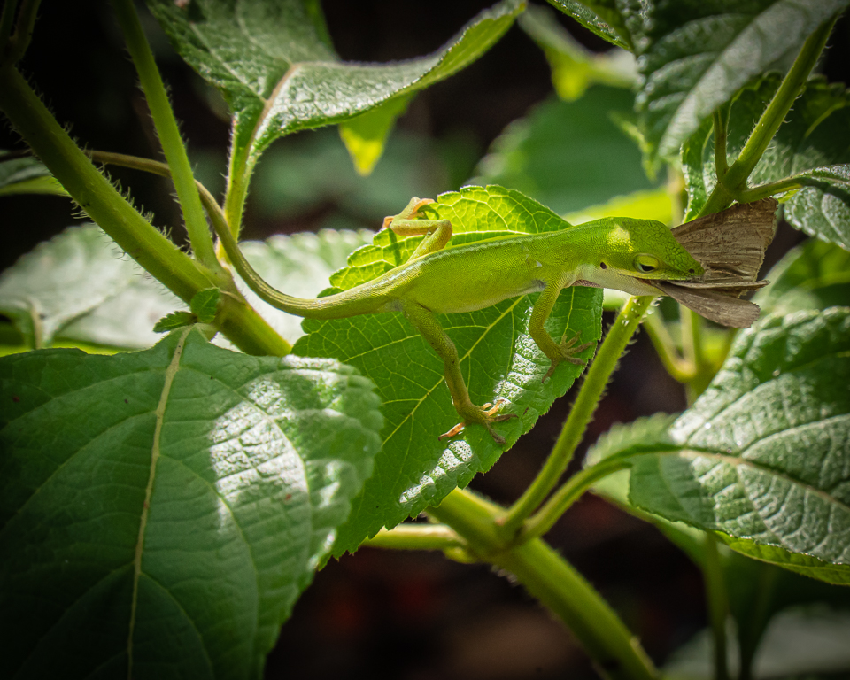 After watering Saturday morning, a walk around the “yard” revealed a few more butterflies than yesterday, though most were Skippers nectaring on the Lantana shrubs. Interestingly, an American Anole was snacking on a moth among the Lantana blooms.