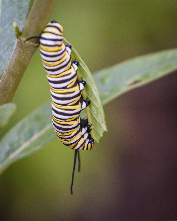 After catching up on news and social media Sunday morning, we monitored the Monarch caterpillars in the back “yard” (yard is in parentheses because the back has no grass, just gravel and a few beds planted with pollinators, crepe myrtles, azaleas, trees, etc.). The caterpillar count was 8, two more than yesterday.