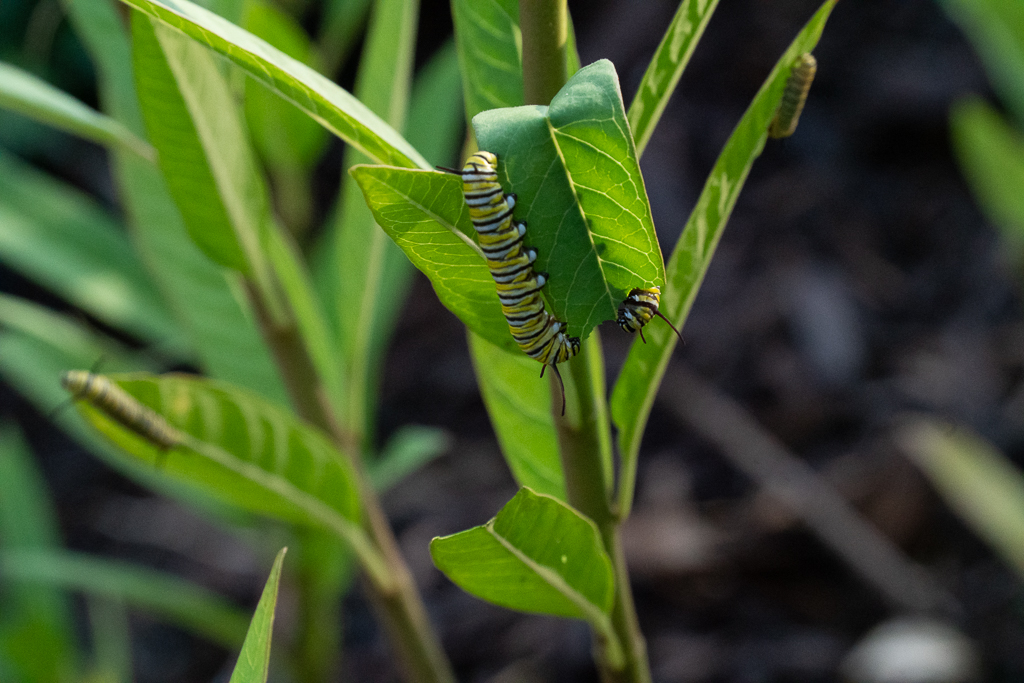 Kay and I have been monitoring Monarch Butterly caterpillars in one of the back “yard” beds. Wednesday’s (September 9) Monarch Caterpillar count was 23. And then Thursday morning (September 10), we counted at least 33,, our highest total yet. One was even on a small solitary plant about 4 inches tall that grew voluntarily. They have really eaten the Butterfly Weed leaves, with some plants totally bare. As yet, we have not seen any chrysalis.