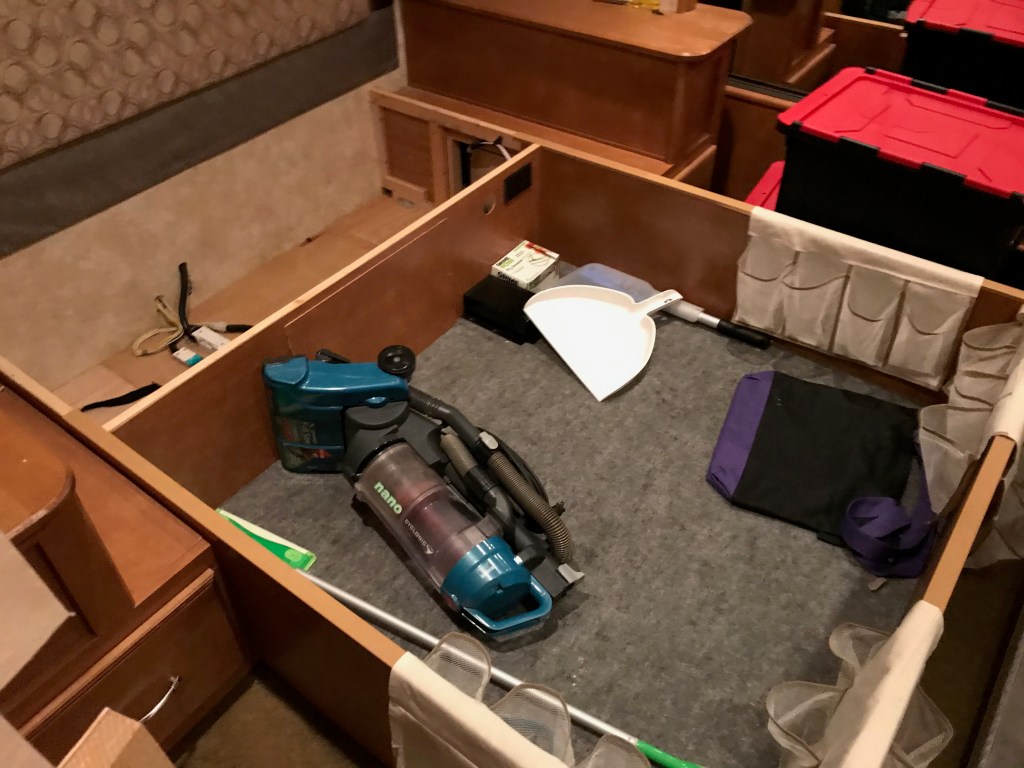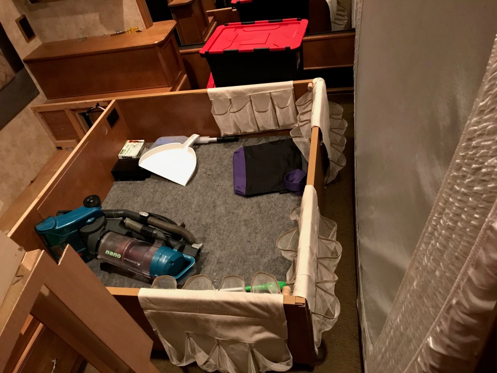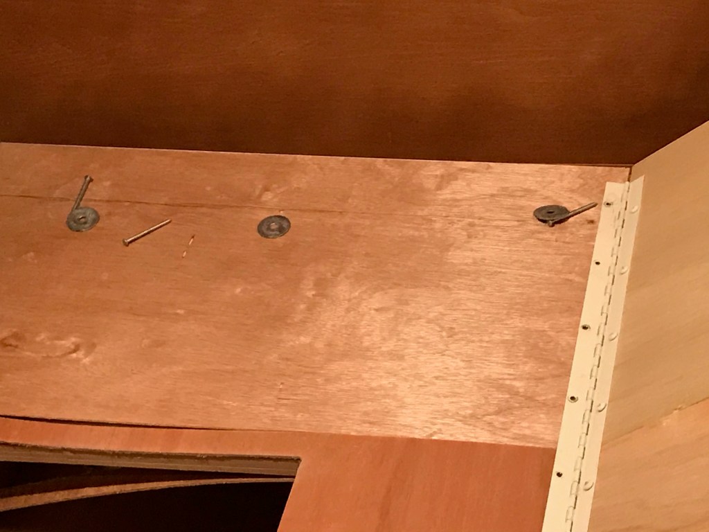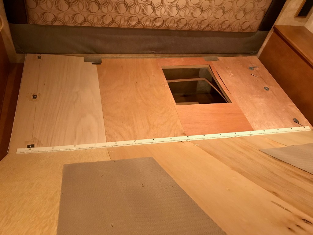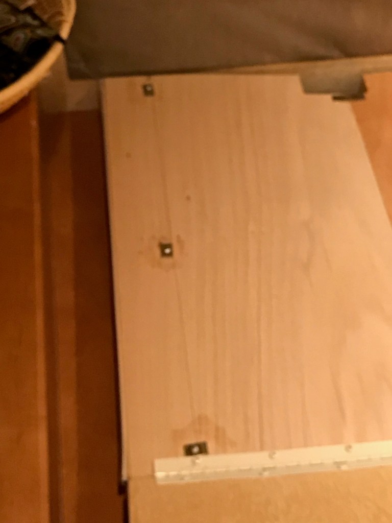 After the caterpillar count, Kay was joined by Pam and Sue for a trip to Little Rock to meet with a financial advisor. He was taken aback that three ladies were going to participate in the discussion, but they prevailed, nevertheless. Meanwhile, I went to the motorhome storage, turned on the generator and then the air conditioner, and extended the passenger rear slide. Forgetting a fresh-brewed cup of coffee left the house, I made a cup in the motorhome. I then proceeded to strip bed clothing off the bed and move the mattress to what little space was available, The bed platform was then torn apart;’ it has been sagging for years, and the storage boxes we use to keep it flat are taking up unnecessary space. Of course, there were lots of screws. For hinges, lifts, etc. When some of the platform grid was exposed, it revealed a number of staples having missed their mark during assembly; pretty shoddy workmanship, and I really expected better from Winnebago. I loaded the platform into the SUV, drove home, and unloaded it in the messy garage. By then it was too hot to work on it—maybe another day! Hopefully, the photos will help in remembering how it goes back together.