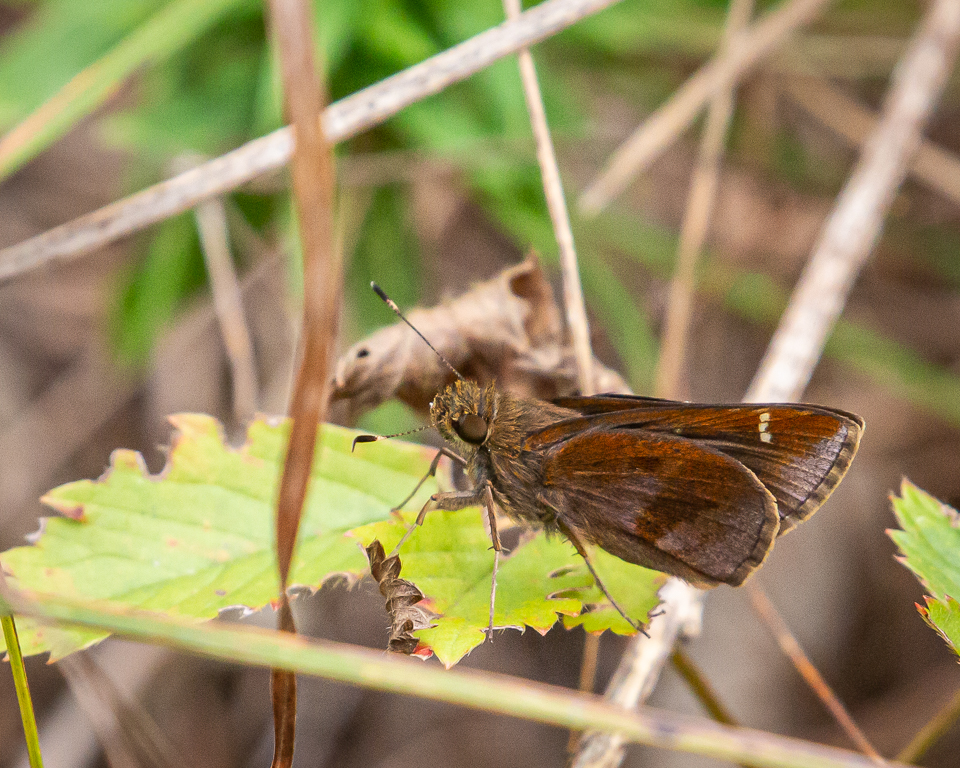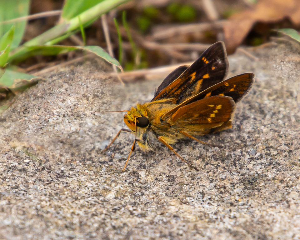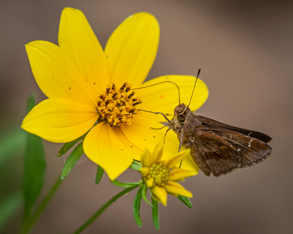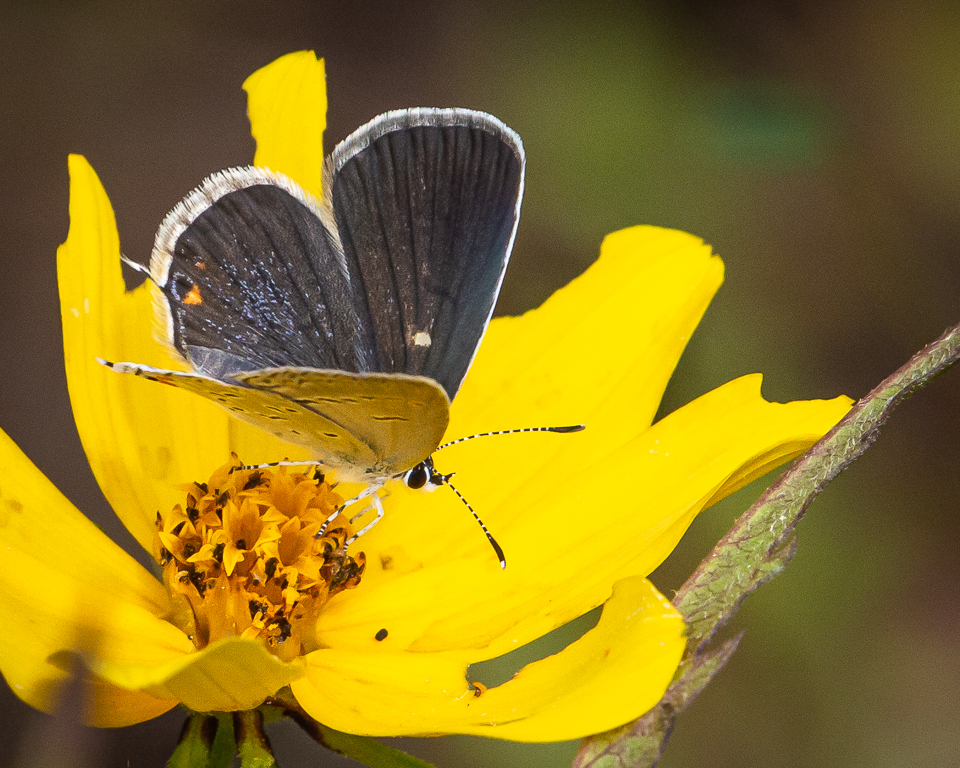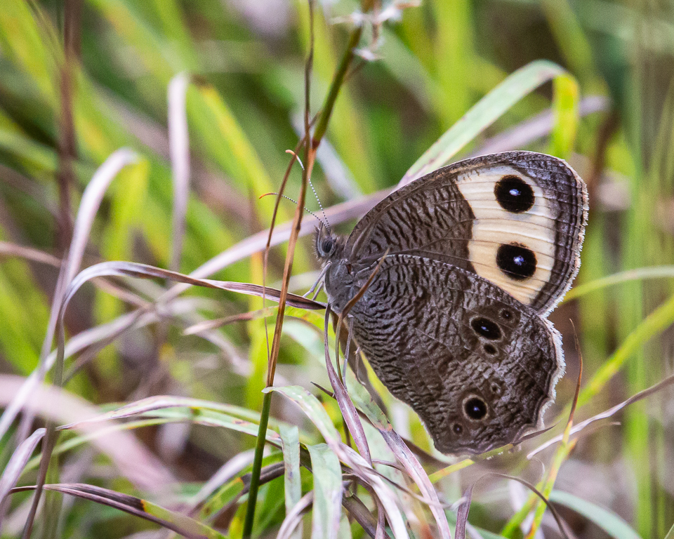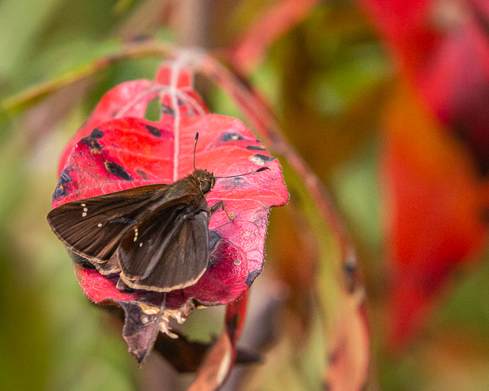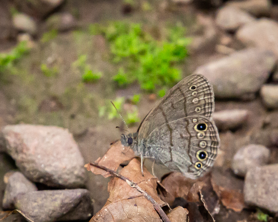 Butterfly ”season” is winding down as fall approaches. We are seeing fewer species and numbers. By the time we made it to near the top of the mountain, fog was rapidly lifting revealing overcast skies. The Visitors Center had few blooms, so we did not stop there. We drove to near Brown’s Spring Picnic Area and walked the gravel road for about a mile towards Mount Magazine Cascades, then looping back along the north ridge edge to the Picnic Area. Several species were observed, but not all remained still enough to photograph, including Carolina Satyr, Clouded Skipper, Common Wood-nymph, Crossline Skipper, Eastern Tailed Blue, Gemmed Satyr, Little Yellow, Northern Pearlyeye, Red-banded Hairstreak, Red-spotted Purple, Black Swallowtail, Pearl Crescent, Eastern Tiger Swallowtail, Zebra Swallowtail, American Lady, Common Buckeye, Red-spotted Purple, Red-banded Hairstreak, etc. Even a Thread-waisted Wasp made an appearance.