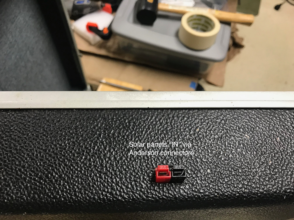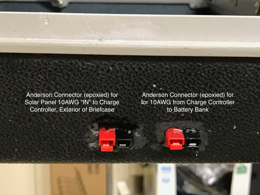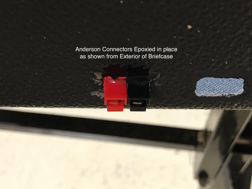 Saturday, I finally got back to working on the Briefcase Solar System. Holes were cut on the left side of the briefcase for Anderson connectors, and the connectors were epoxied in place. See photos below.