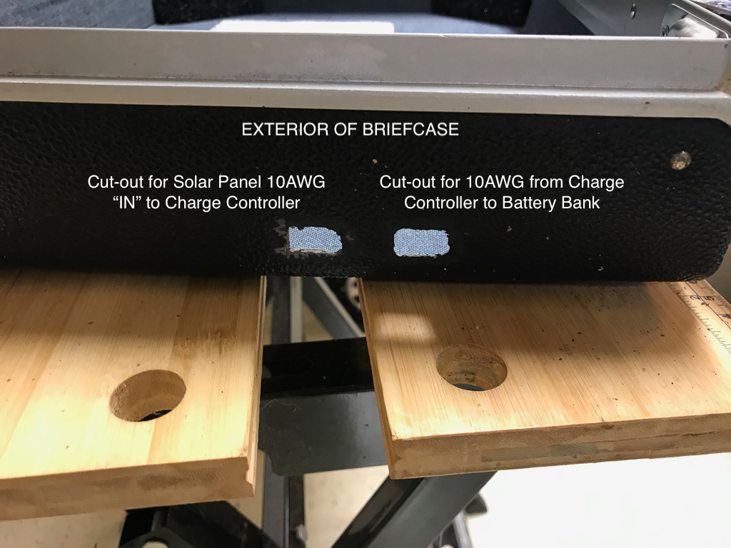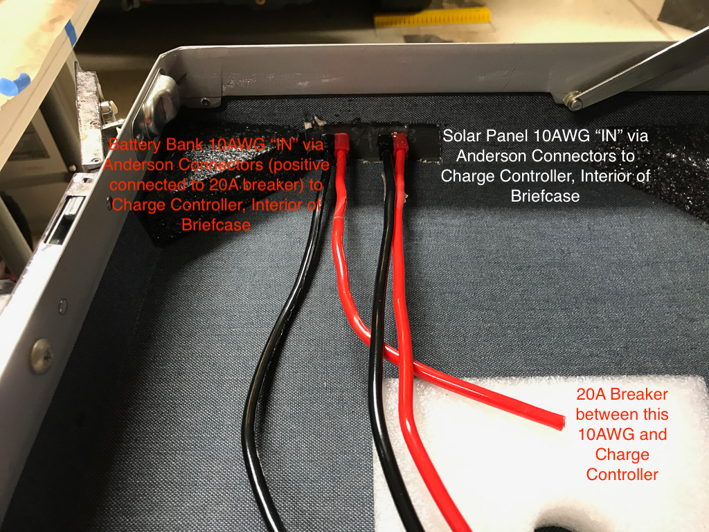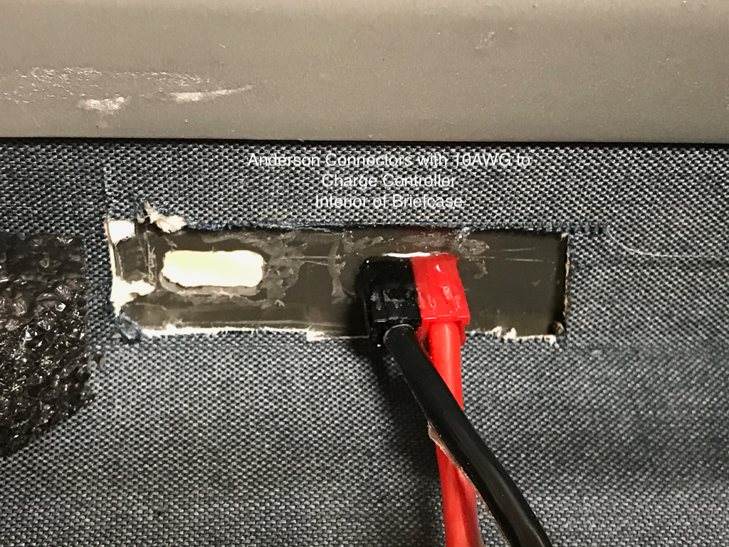 10AWG wire was attached to the Anderson connectors on the inside of the briefcase. One set will be from the solar panels to the charge controller, and the other set will be from the charge controller to a battery bank, including an inline breaker.