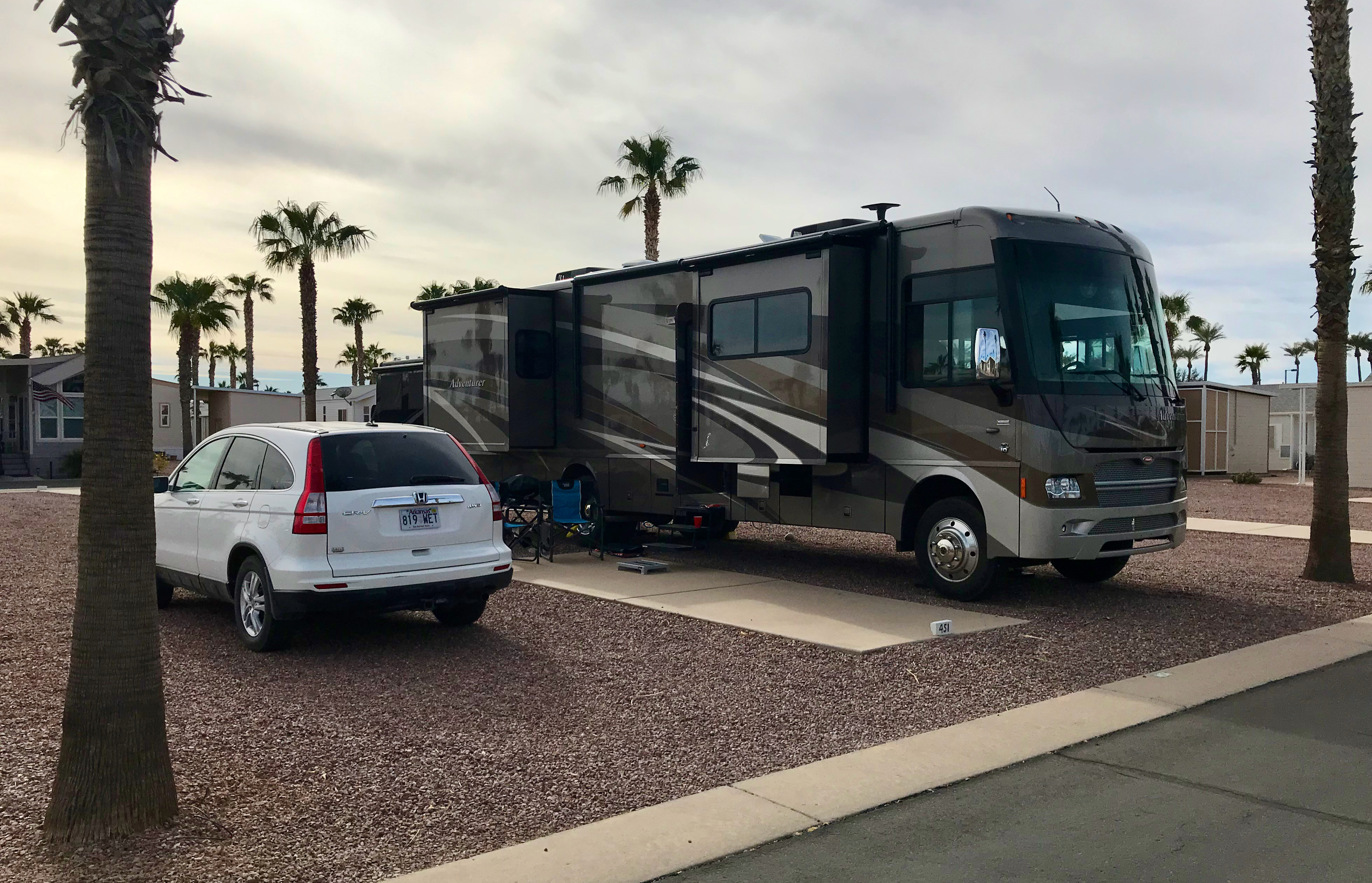 Still not feeling well on Monday, I decided Tuesday morning to travel to our winter residence, Palm Creek in Casa Grande, AZ. It would position me to better take care of health issues should the virus progress. The 141-mile drive Tuesday morning was mostly via I-10, through Tucson, and without issues. After checking in and being escorted to the site, the motorhome was partially setup. The potable water was connected, via the water softener, and an external propane tank was connected to the Extend-a-Stay installed a few weeks ago (to save on the exorbitant cost of propane delivered to one’s site. Some of the bays were emptied, though I brought so many toys and so much junk that it’s hard to sort through all of it. The bicycles were unloaded and the bicycle carrier and front tow bar were removed from the toad (old Honda CRV). A quick wash and vacuum partially removed all the dust and grime, though enough remains that it will have to be done again, and again. Tonight, bedtime came early.