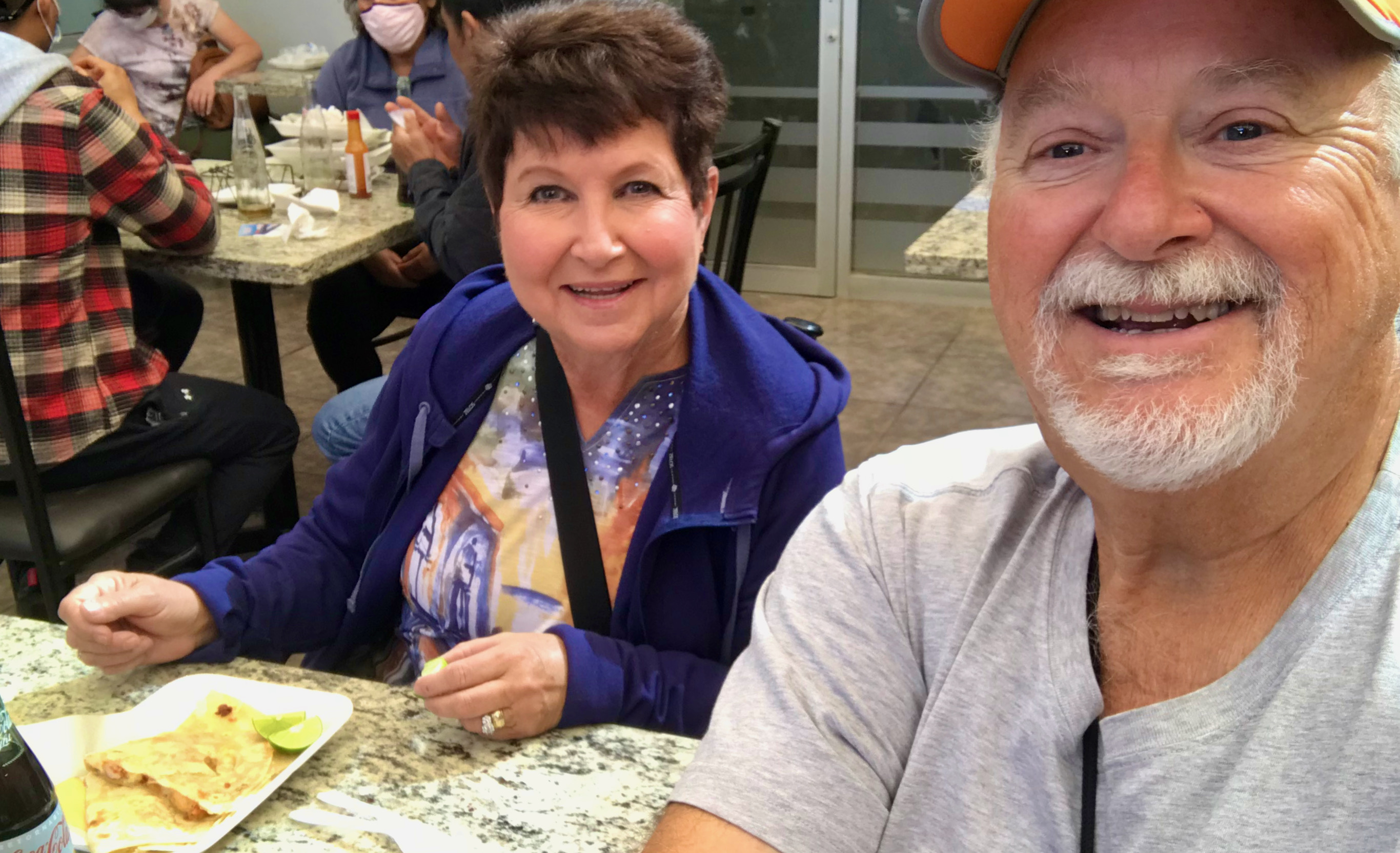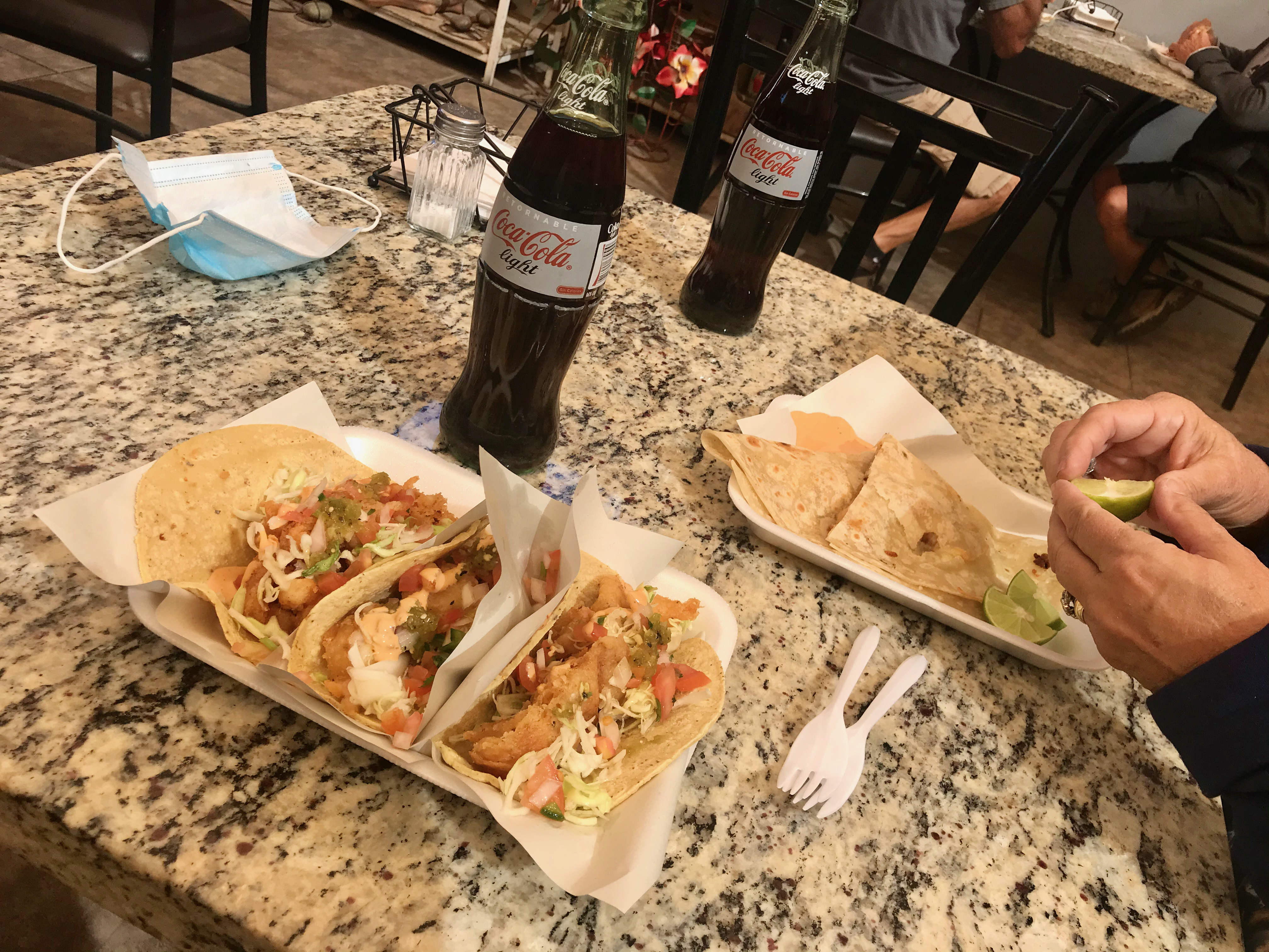 We ate lunch at a great little street restaurant. The shrimp tacos and quesadillas were quite good and inexpensive; our meal, including light (diet) cokes in bottles, cost $13 American. After lunch, we shopped at the pharmacia and bought antibiotics and arthritis meds—vastly cheapen than in the US—which we keep on hand for travel. The border crossing, both ways, was uneventful and we only had a 5-10 minute wait entering back into the US.