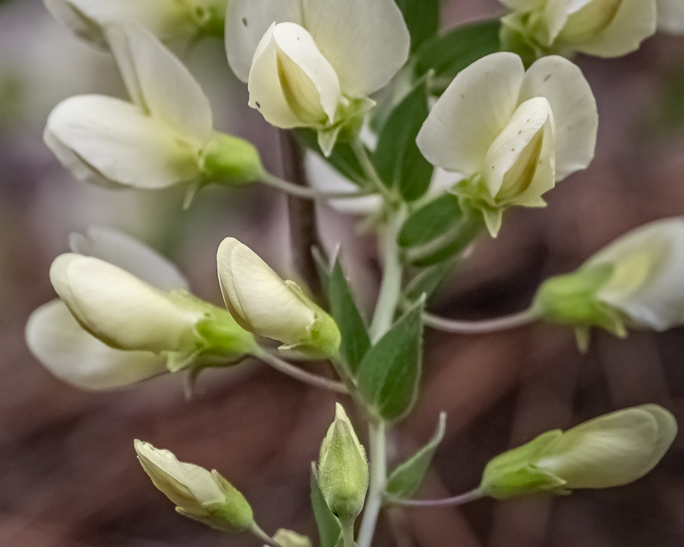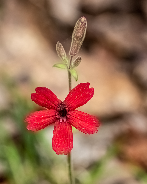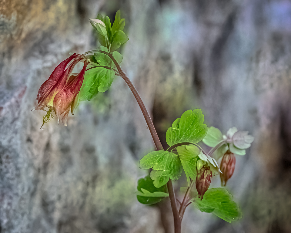 Kay and I traveled to Mt. Magazine Saturday for a long hike. It was in the mid-60s with partly sunny skies. However, at the top of the mountain it was 44°, overcast, with moderate winds. Thus, no hiking or photography: we went to the restaurant for lunch instead. While this Columbine was photographed at the Visitors Center, the unknown flower did pose for photos on the way down the mountain.