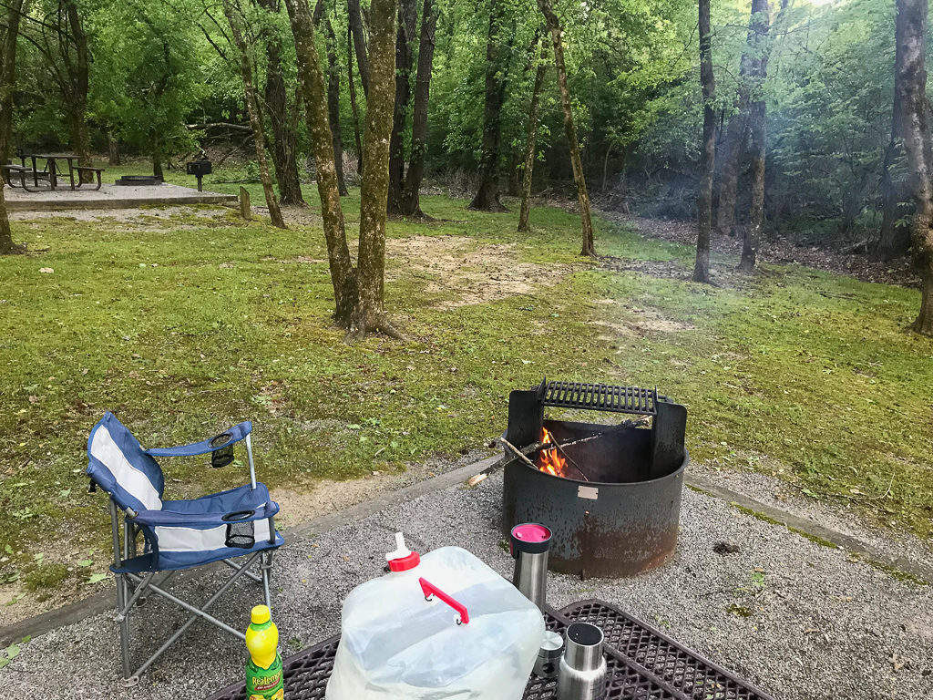 The wind had abated considerably, and the fire pit beckoned a campfire. The wind last night blew down several small limbs and twigs, and the “pickins’ were easy”. Water was heated for the French press, and with coffee in hand, I sat by the campfire and contemplated world problems. By the time the first cup of coffee was drunk, most of the problems were solved.