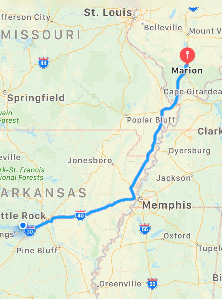 Our route took us east via I30 to I40 to I55, and then north to I57 all the way to Marion, passing through Arkansas, Missouri, and Illinois, arriving a few minutes before 7:00 pm.