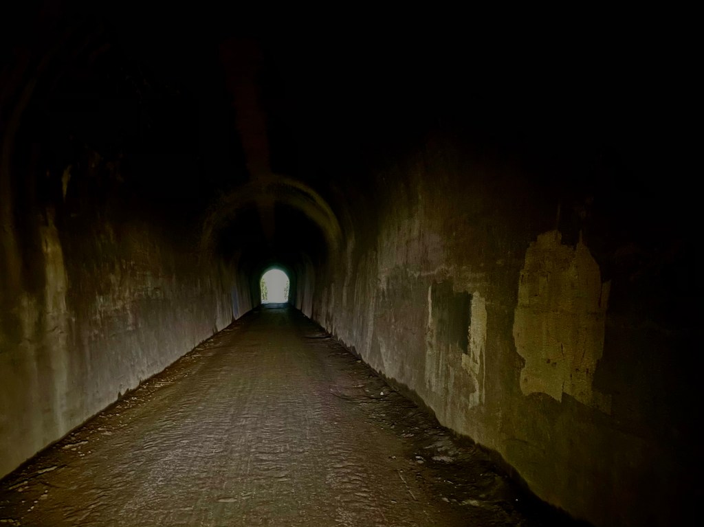 After only a couple of minutes of cycling south, the tunnel for which the trail was named came into view. Having ridden a number of lengthy rail trails with foreboding tunnels, this one was much less ominous than described in the trail information, though I was outfitted with both a bicycle light and a head light.