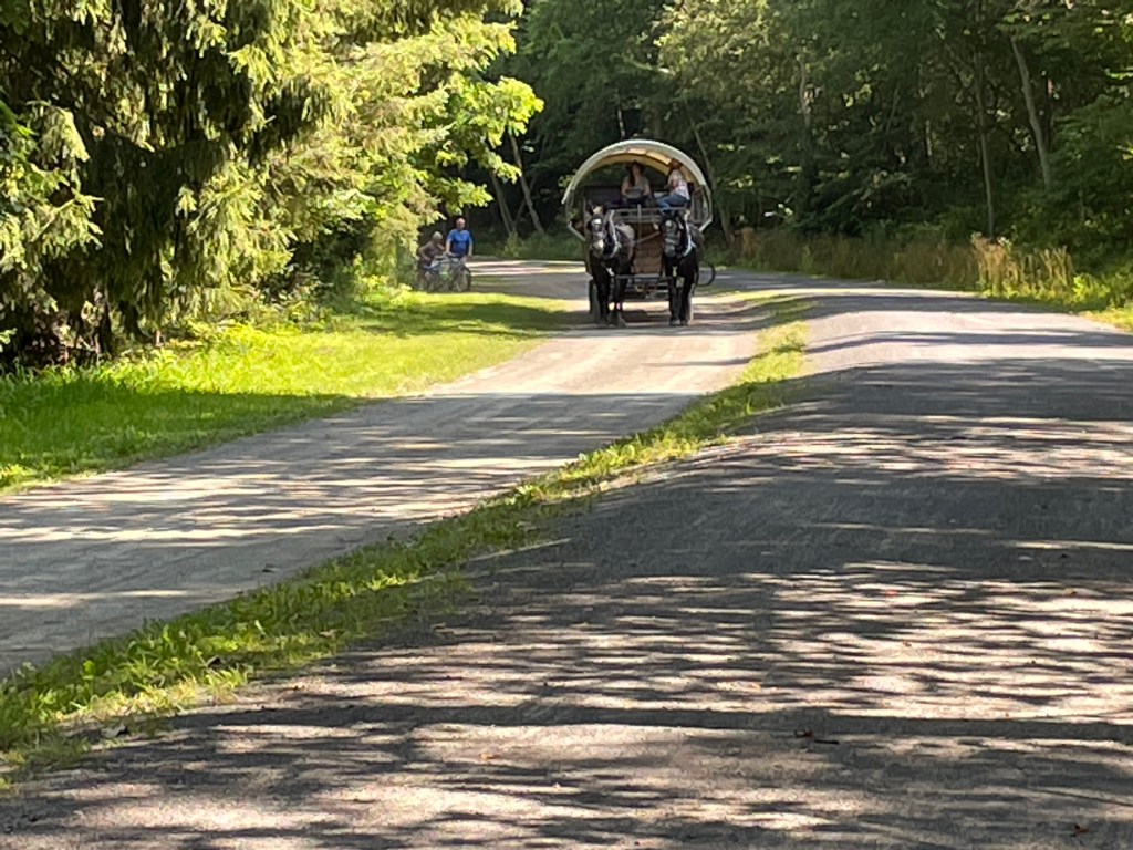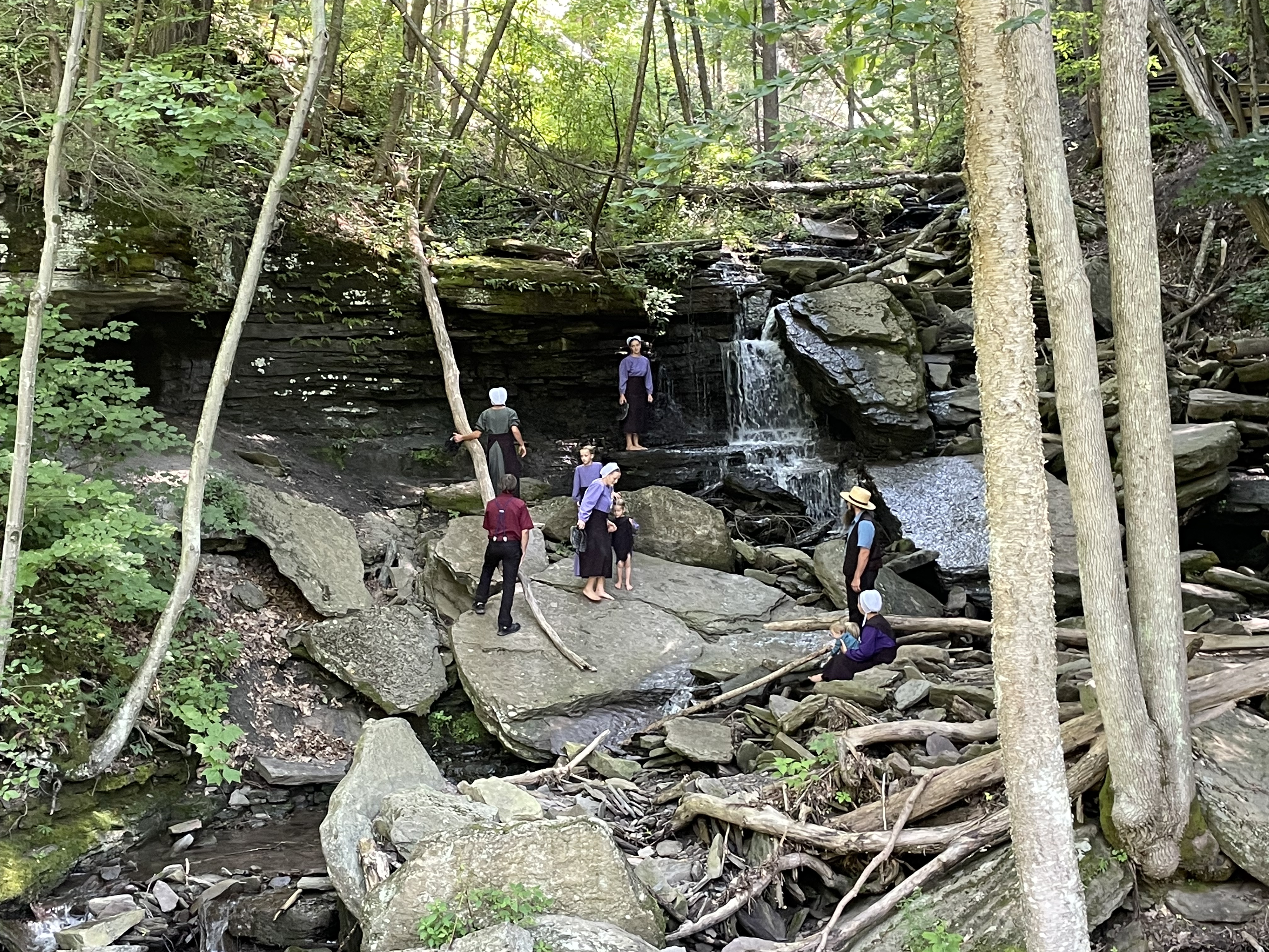 While casually admiring the awesome scenery, a slight roar of a waterfall could be heard and the tiered waterfall of Fourmile Run, came into view. There, a supervised group of Amish or Mennonite teens were frolicking in the falls.