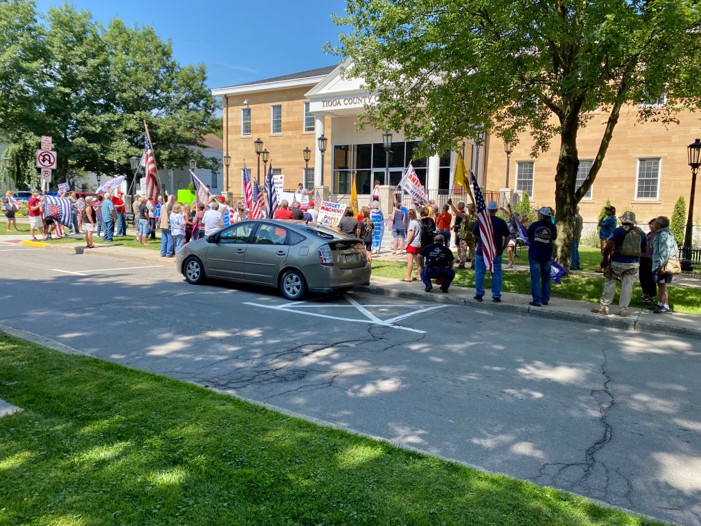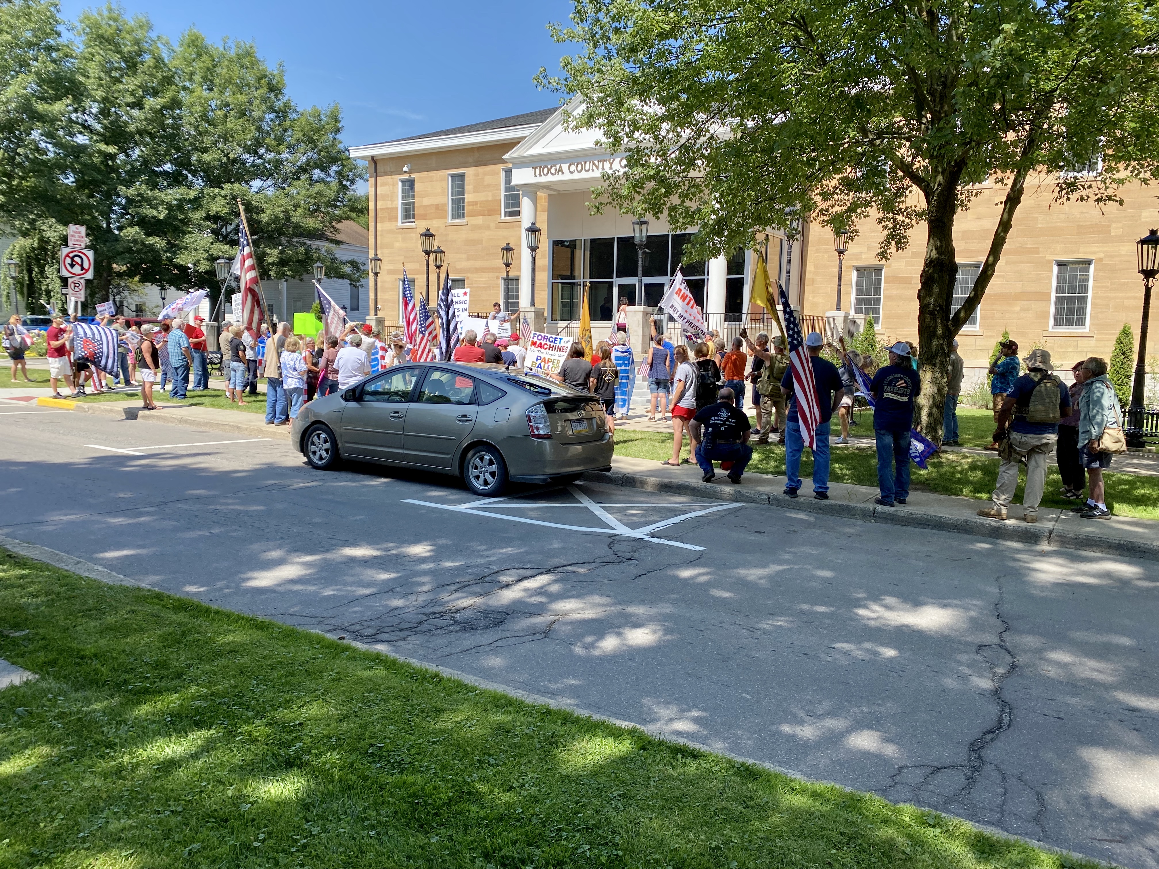 We are in Wellsboro, PA for two days/nights. Today after I dropped Donald off at the bicycle trail head, I came back to town to explore Main Street shops and take some pictures. Much to my surprise, there was a crowd gathered on Main Street right in front of the county courthouse. There appeared to be more Republicans than Democrats and they were protesting because they want an audit of Tioga, York, and Philadelphia counties because they believe the count was inaccurate – Tucker Carlson’s name was shouted as an ‘expert’. I didn’t hear or see any support explicitly for ex-President Trump. Most appeared to feel Democracy is threatened when the vote is considered flawed. Their request for an audit has been denied and that is what had them ‘hopping’ mad. No explanation was given for the refusal, according to a bystander. There was some chanting by both sides, but for the most part their demonstration was peaceful. The following article may explain what all the furor is about. A State Representative Doug Mastriano is behind the audit and is fighting for support. He has been a staunch supporter of the former President. The “Lies” are behind these efforts to destabilize the voting systems and possibly change elections. There would be substantial costs to replace voting systems because they would be decertified if turned over to a third party audit. https://www.forbes.com/sites/alisondurkee/2021/07/14/pennsylvania-audit-pushback-intensifies-as-gop-county-refuses-to-turn-over-election-materials/