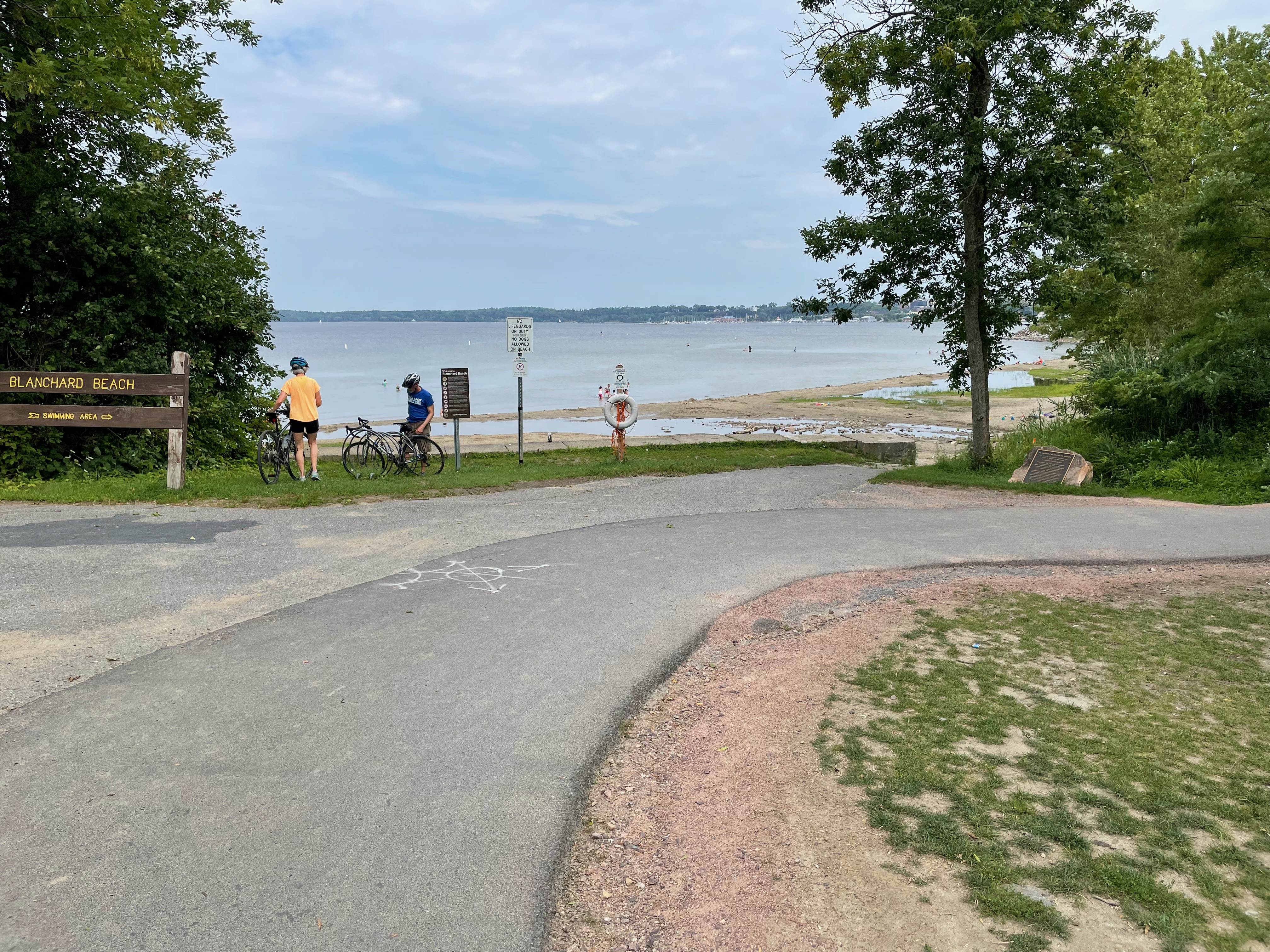 The trail was heavily used today, and signage in the developed area was poor to non-existent, mainly because of construction and accompanying detours, reminding me of all the detours of the Razorback Greenway in Bentonville, Arkansas. The mostly finely-crushed granite surface made for excellent cycling. Views of Lake Champlain and moored sailboats were almost constant, except for the short segment of trail through a natural area.