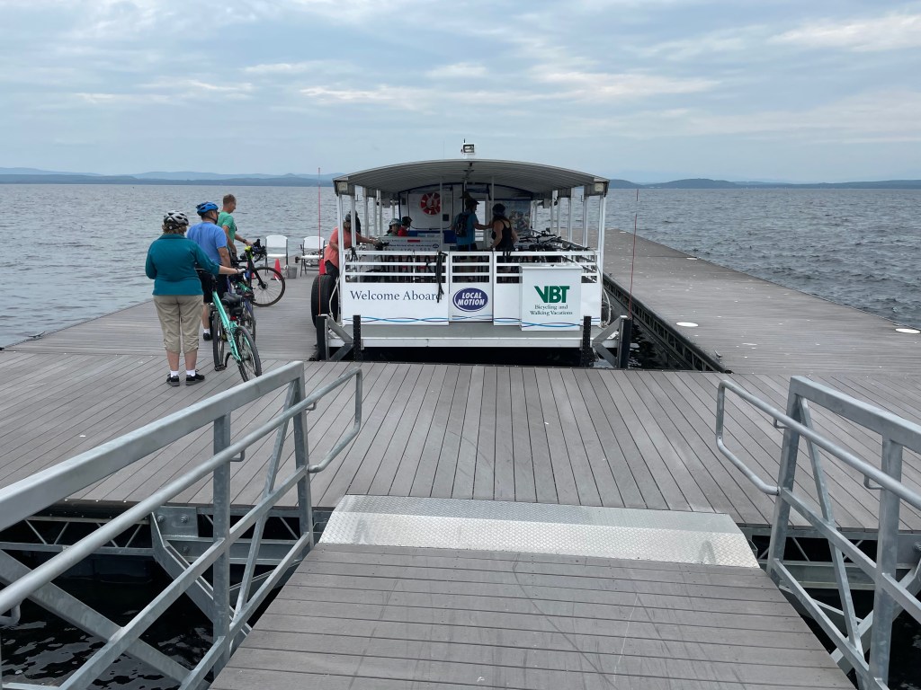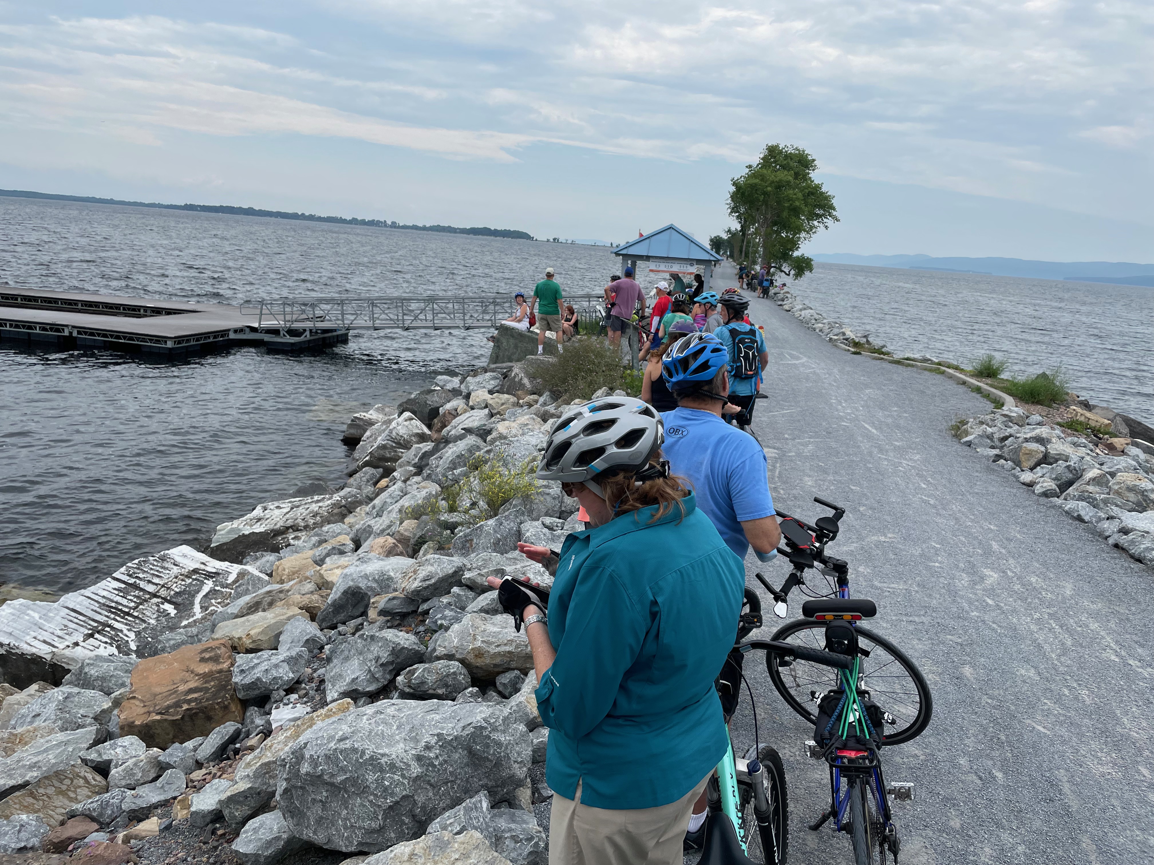 Once on the actual causeway, there were surrounding breezes and lapping waves from Lake Champlain.The gap on the northern portion of the causeway resulted in a necessary stop, or turnaround point. However, the seasonal bike ferry was unloading passengers and bicycles for the short ferry around the gap. Because it was lunch time, there was a waiting line, and it took two more ferry trips before I was near the beginning of the queue. A $10 donation secured a roundtrip ticket on the oversized pontoon boat. Due to a 200-foot gap in the causeway, the organization Local Motion operates the Island Line Bike Ferry to shuttle cyclists across the gap, thus the “donation.” The return trip to meet Kay was into the breeze from Lake Champlain, and the headwind was a bit stronger than expected.