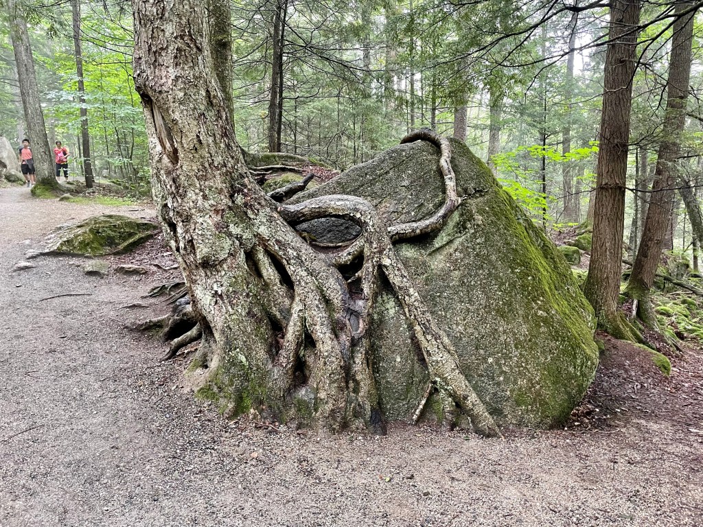 As we walked through this area, many isolated boulders were lying beside the trail; many had roots of trees encapsulating them. Some were quite large, and all were rounded. As glaciers from historic times retreated, these boulders were left behind; they are called glacial erratics.