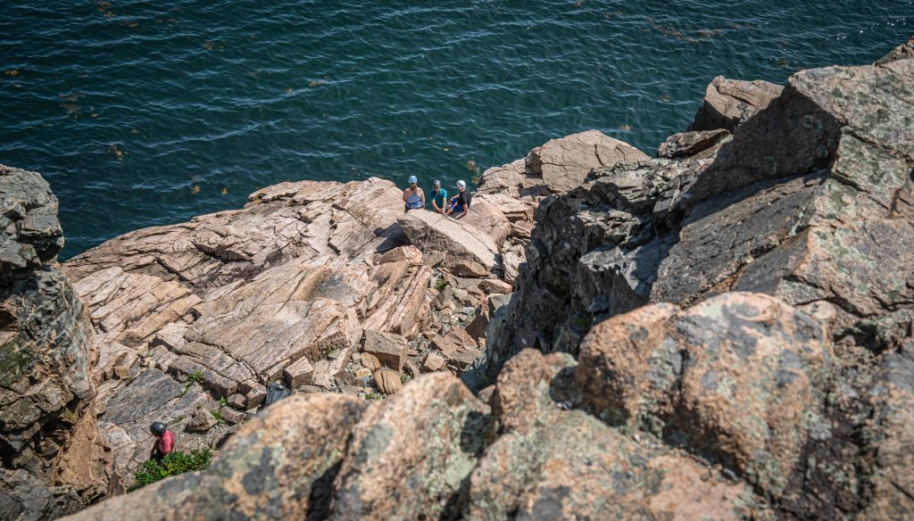 We were fortunate to find a parking spot at the Thunder Hole store, and walked to the rocky coastline to see Thunder Hole. The low tide negated most of the sound and splashing of waves. People were everywhere, and there were many families of five or more children, and couples with leashed dogs swarming the place. The coastline was starkly beautiful at low tide, but climbing over the boulders and avoiding the steep drop-offs was challenging for our old bodies and joints. However, a number of young folks were rappelling off the side of the shoreline cliffs.