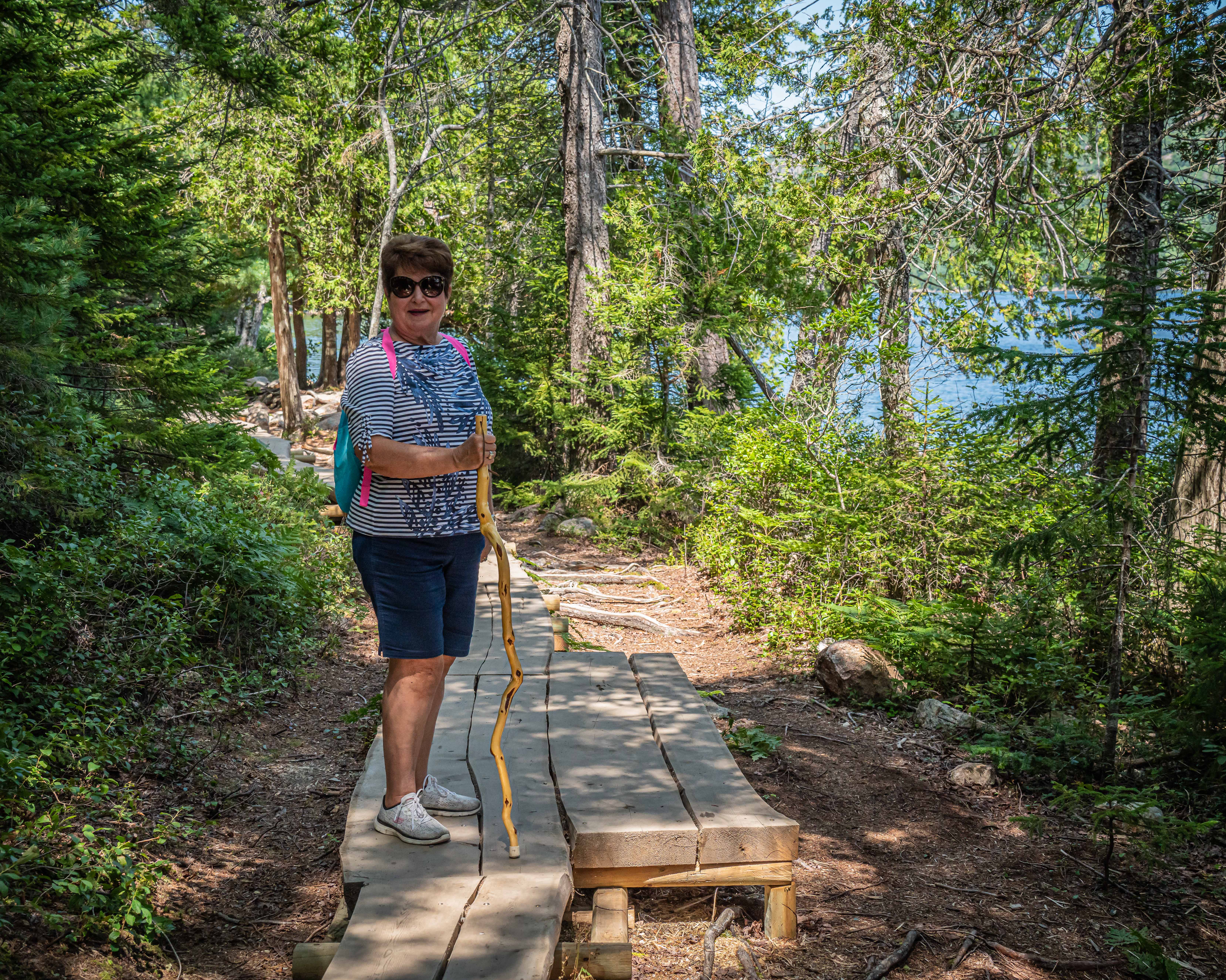 Jordan Pond was next. It is one of the park’s most pristine lakes, with outstanding surrounding mountain scenery. Glaciers carved the landscape, leaving behind numerous geological features. Jordan Pond proved to be the Acadia Park’s most visited attraction where visitors can canoe, kayak, cycle, hike, or enjoy a carriage ride. Kay and I hiked a bit of the loop trail. The Jordan Pond House serves famous tea and popovers, and all the dining facilities were at capacity.