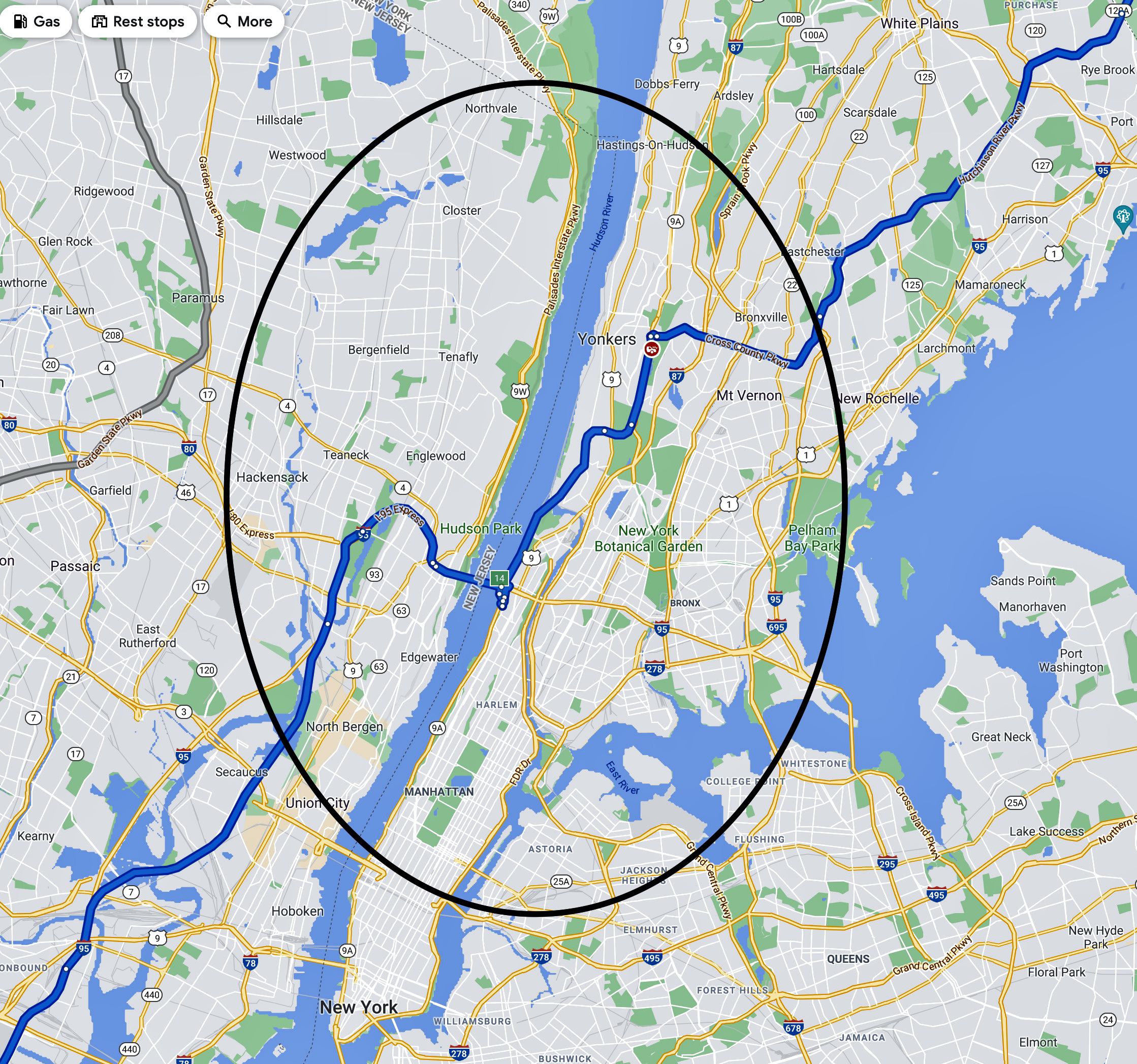 We traveled from Maine through New Hampshire, Connecticut, and Massachusetts before reaching New York, New York, at 5 PM during RUSH HOUR. The GPS directed us right through the middle of downtown New York on Central Park Avenue, through the Bronx, across the George Washington Bridge, and into New Jersey.