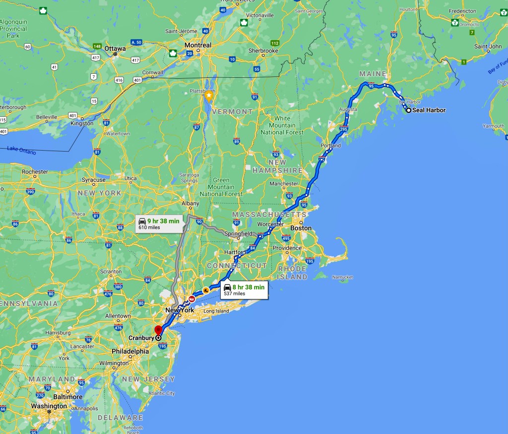Having seen and done everything on our list, we opted to leave Acadia National Park and Maine a day early. Our next destination was near Richmond, Virginia, to visit Kay’s sister and brother-in-law. Too long to drive in one day, our objective was to make it past the city of New York before overnighting.