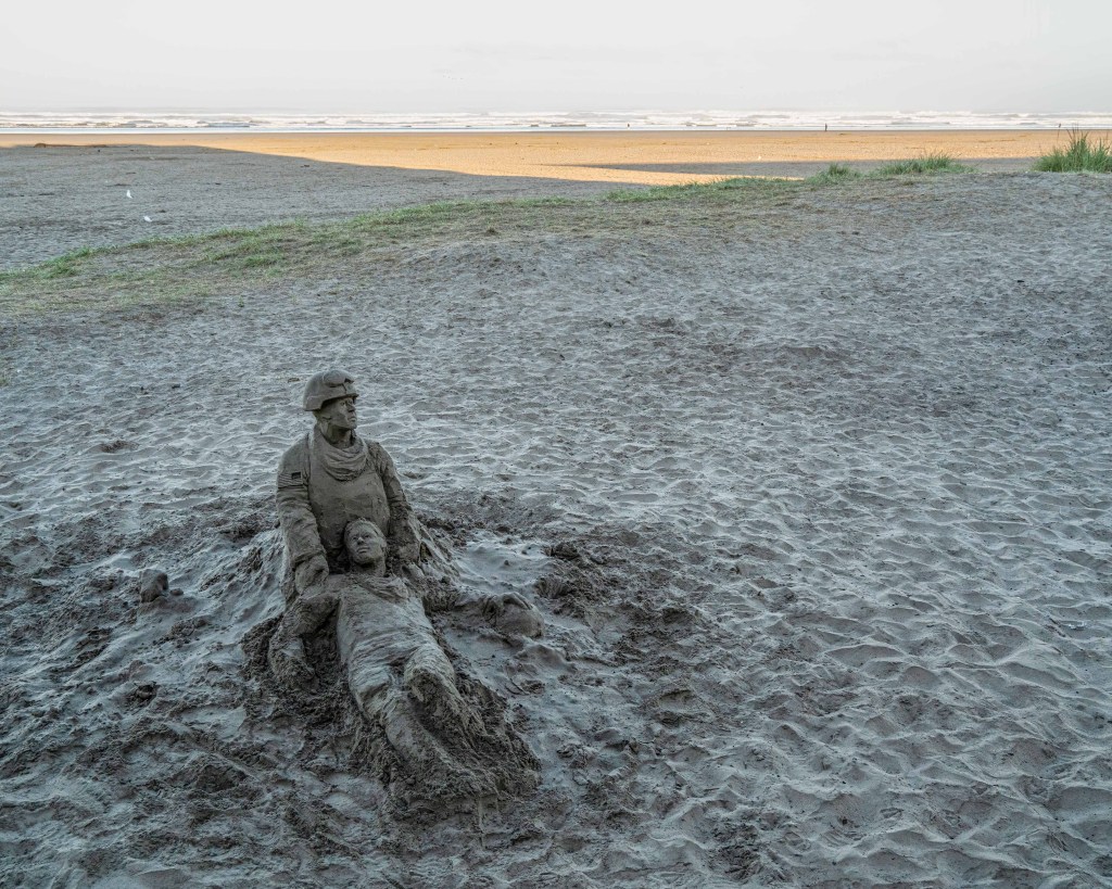 After overnighting at Seaside, Oregon, we walked the promenade, enjoying the cool ocean breezes and lightly crashing waves on the dark sandy beaches. A thought provoking sand sculpture on the beach greeted us as we stepped onto the promenade, with my thoughts immediately going to VietNam, though the sculpture could represent any modern war.