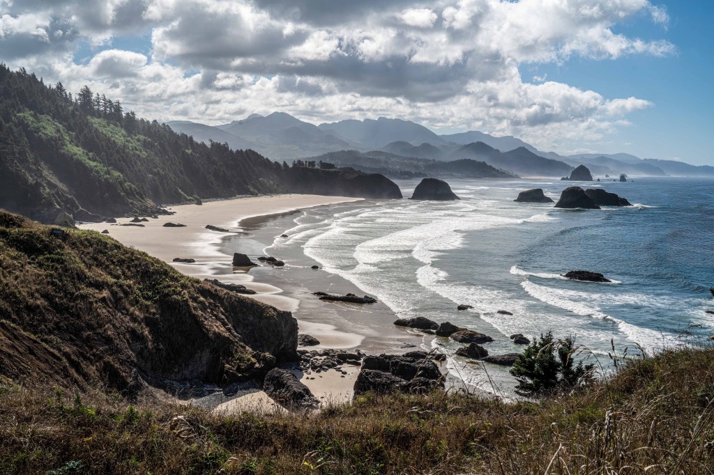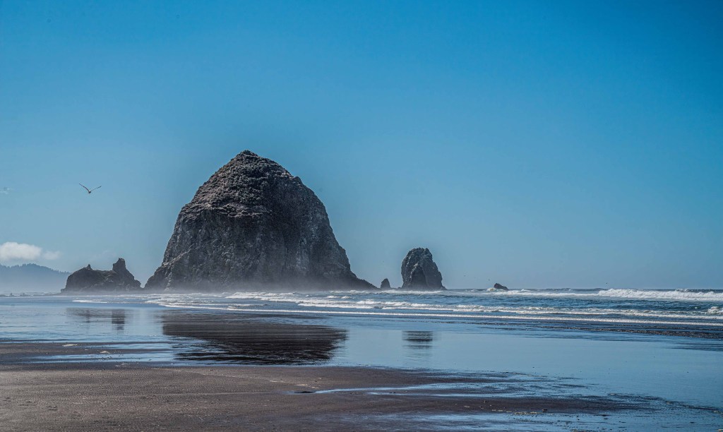 A drive further down the coast brought us to the small town of Cannon Beach. Parking near the ocean, we made the short walk down to and along the beach, inching closer to Haystack Rock with each step. The outstanding view from this beach location was another place where one could tirelessly while away the day. This was perhaps one of the most beautiful scenes I experienced.