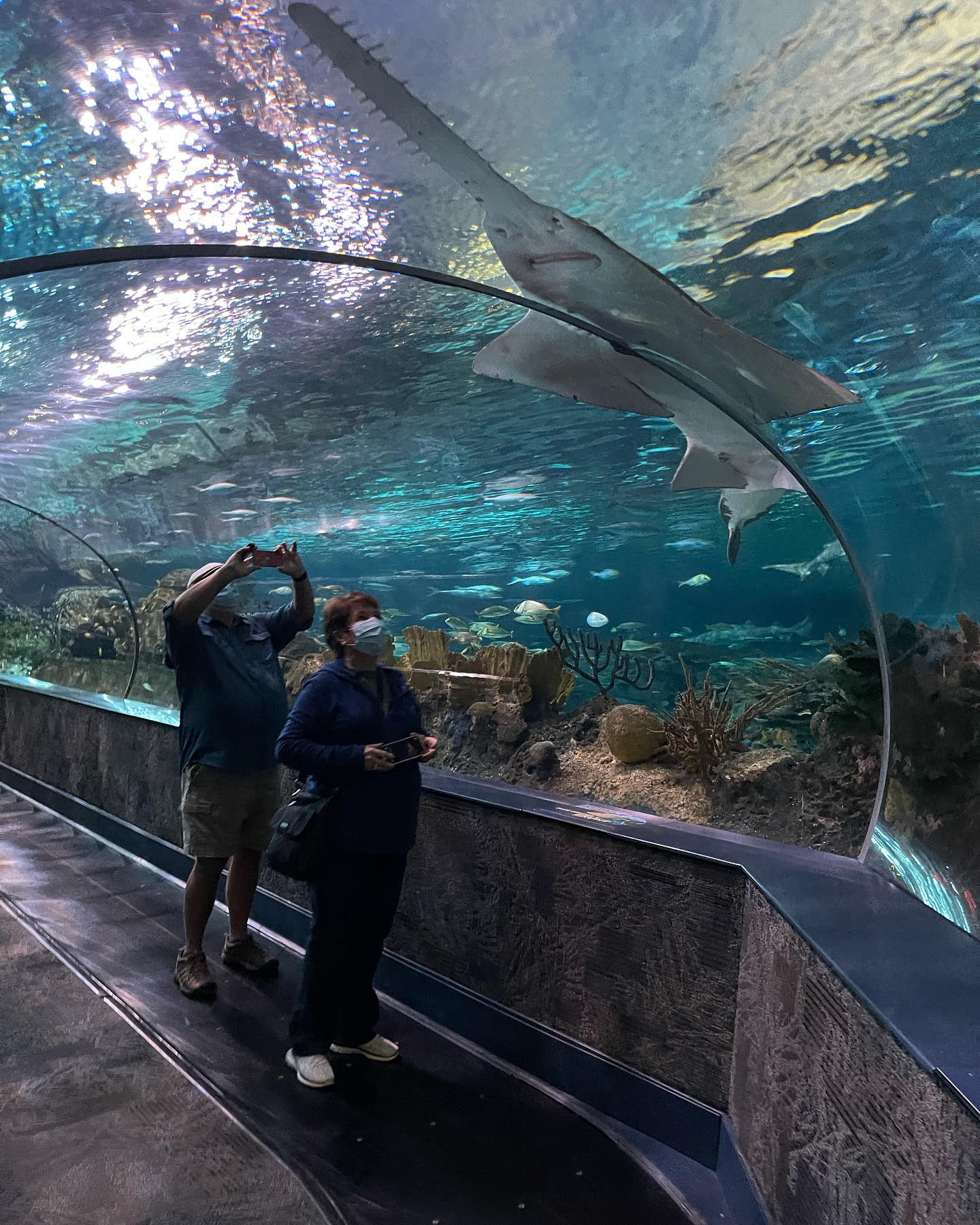 Today, we visited Ripley’s Aquarium of the Smokies. This 115,000 square foot, 1.3 million gallon aquarium in Gatlinburg, TN, has over 10,000 exotic sea creatures in 350 individual species. Our favorite feature was the 340-foot underwater tunnel with a glide path; in the words of Karyn, “… And a moving sidewalk inside the underwater tunnel was genius. No looking where you are walking. Just hop on and enjoy the ride and the scenery!” It was neat watching the sharks and rays gliding above and around you while in the tunnel. (Thanks to Karyn for photographs.)