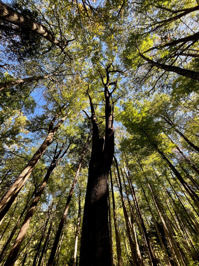 Matt suggested we find an old growth forest area in which to hike, and what a great idea it proved to be. Almost 99 percent of old-growth trees on the East Coast of the United States have been removed. However inside the half million acres of land within the GSMNP, about 100,000 acres of old growth forest can be found scattered about here and there. Most of the time to find these old growth areas, you are going to have to hike for a while to get into the middle of these areas. Matt found an exception, the Chimneys Picnic Area in near Gatlinburg. We hiked almost a mile up the Cove Hardwood Nature Trail, and found ourselves surrounded by a pristine section of old growth forest. Towering hardwoods with their limbs intertwined to shade the floor of the forest and create a canopy was mesmerizing.