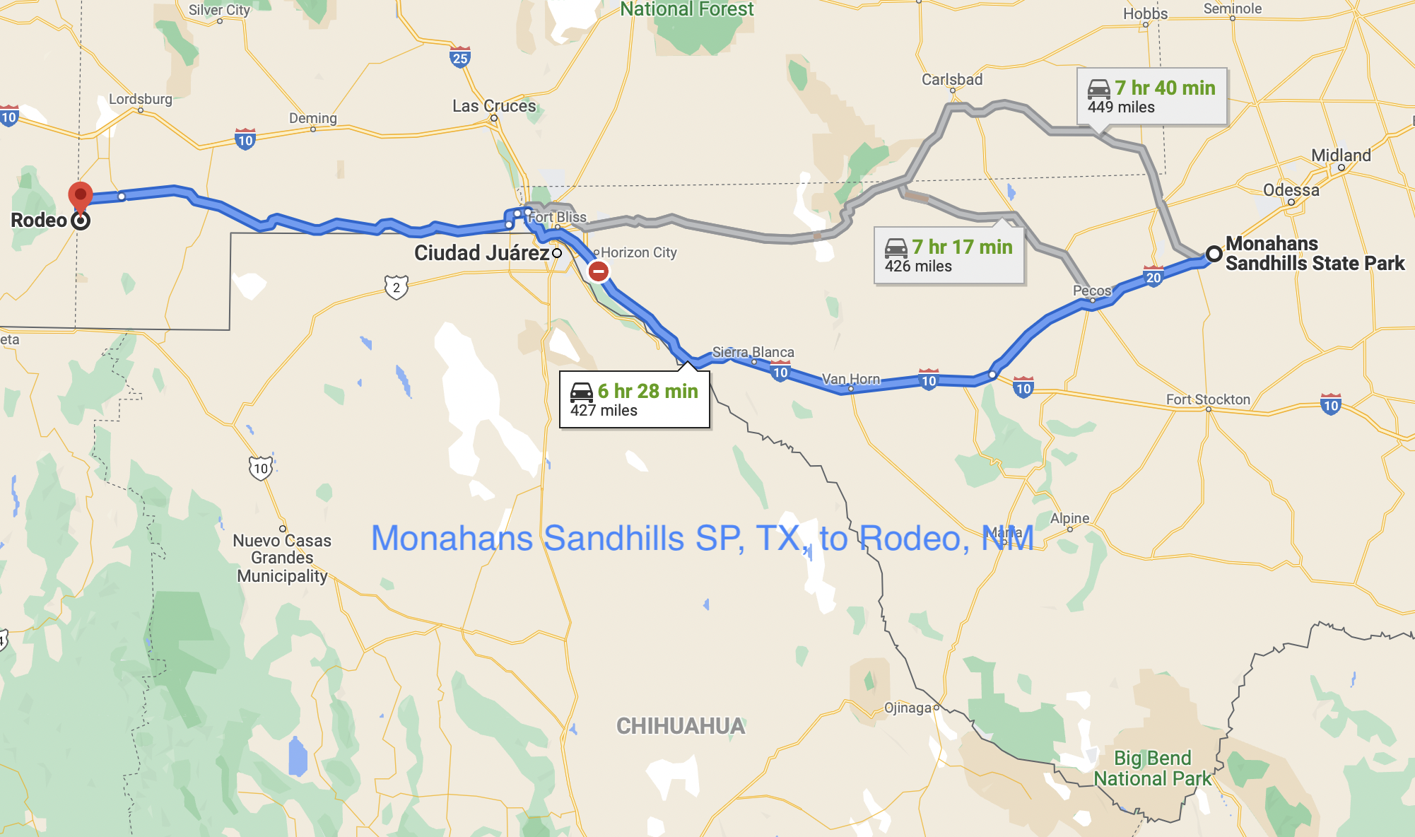 We were on the road by 9 AM, headed west on I-20. The topography began changing once we were past the Permian Basin. The “hills” and bit more vegetation were a welcome change. We merged with I-10 and crossed into Mountain Standard Time near Van Horn, Texas. The topography drastically changed after we traveled through El Paso shortly after noon, with the hills becoming steep, craggy mountains, generally free of vegetation. Pistachio orchards began appearing and continued as we crossed into southwestern New Mexico. Near the New Mexico/Arizona border, we turned south toward our first target destination, Rusty’s RV Ranch in Rodeo, New Mexico, arriving at about 5 PM. The remainder of the evening was spent setting up, and enjoying the New Mexico sunset.